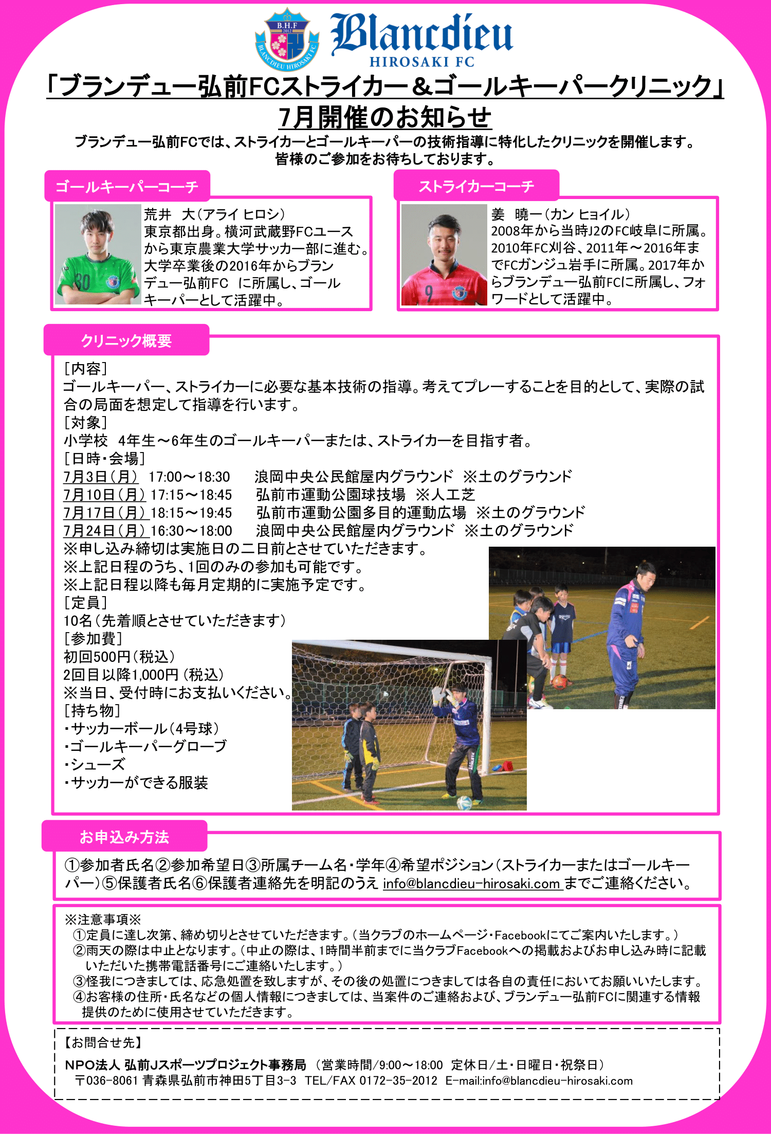 この度、ブランデュー弘前FCでは、小学校4年生から6年生を対象に開催している「ブランデュー弘前FCストライカー&ゴールキーパー クリニック」の7月開催日程が決定しましたのでお知らせいたします。