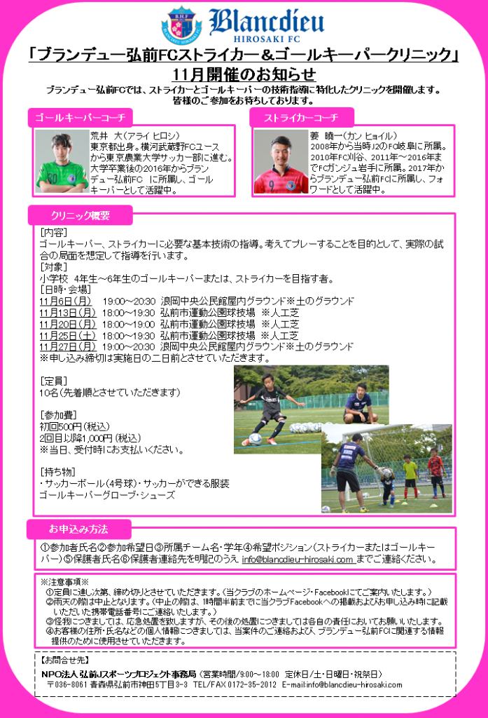 この度、ブランデュー弘前FCでは、小学校4年生から6年生を対象に開催している「ブランデュー弘前FCストライカー&ゴールキーパー クリニック」の11月開催日程が決定しましたのでお知らせいたします。ぜひご参加ください。