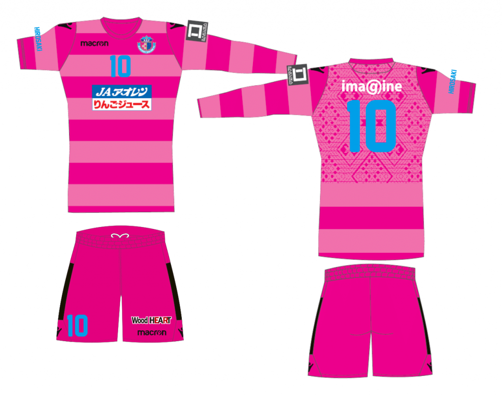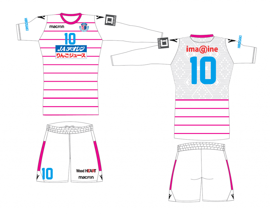 今回のこの柄は「蜘蛛刺し」「トマラズ」「テコナコ」の三つのモチーフを組み合わせて作られております。蜘蛛の巣のような緻密なフォーメーションでボールを止めることのない勢いのあるプレーと、桜色にテコナコ(蝶々)を舞わせ、春の雪解けで盛り上がる津軽の春のエネルギーがチームに注がれることをイメージしました。このユニフォームで弘前のプライドとサポーターのパワーを纏い東北、そして全国で活躍をして欲しいという願いが込められています。