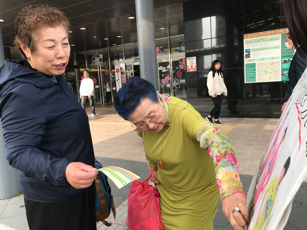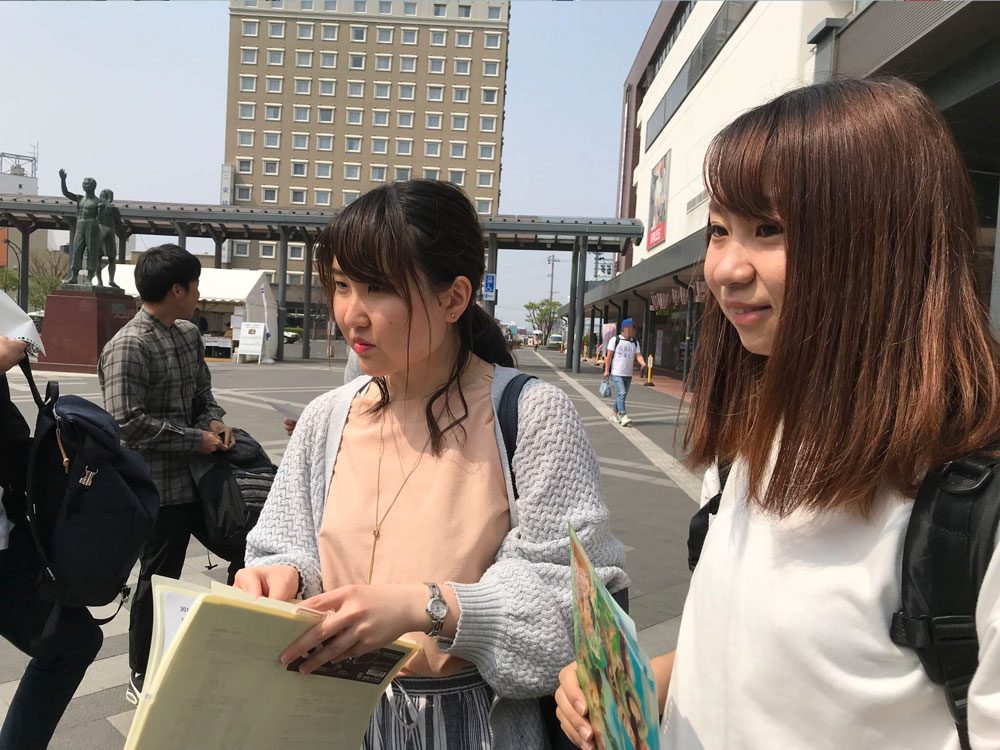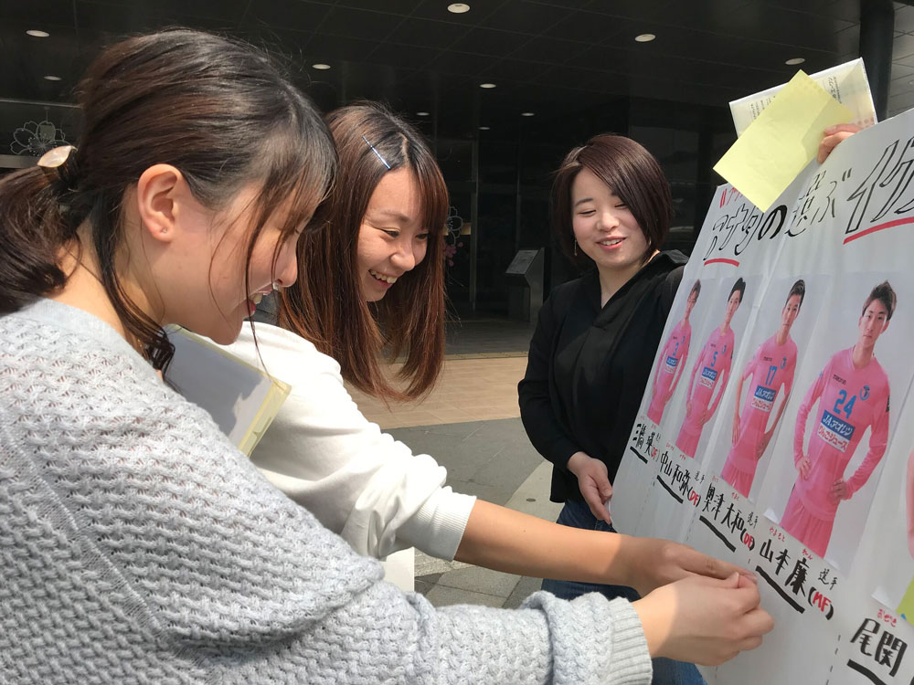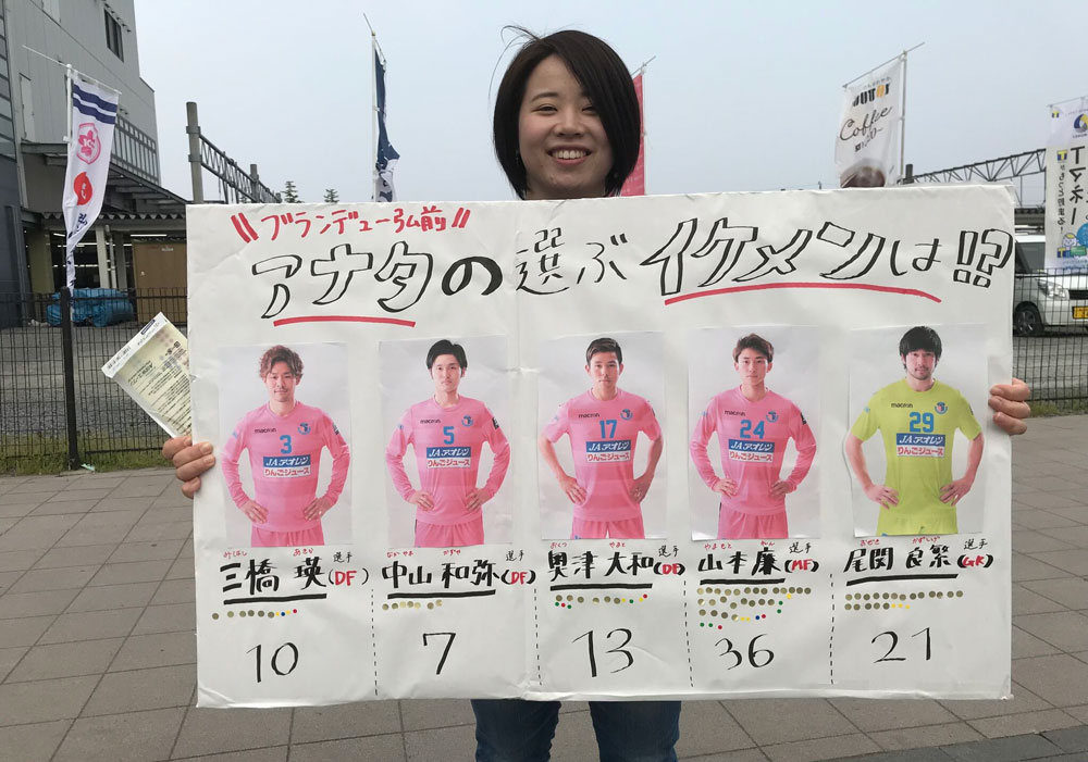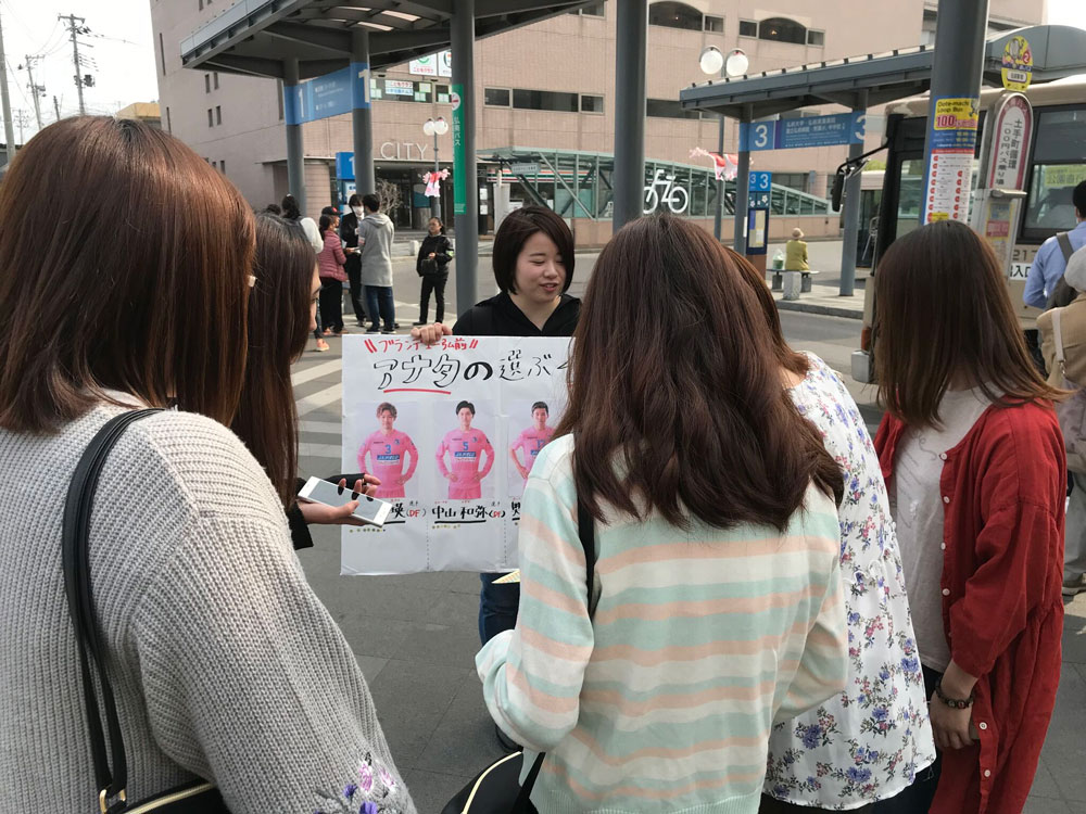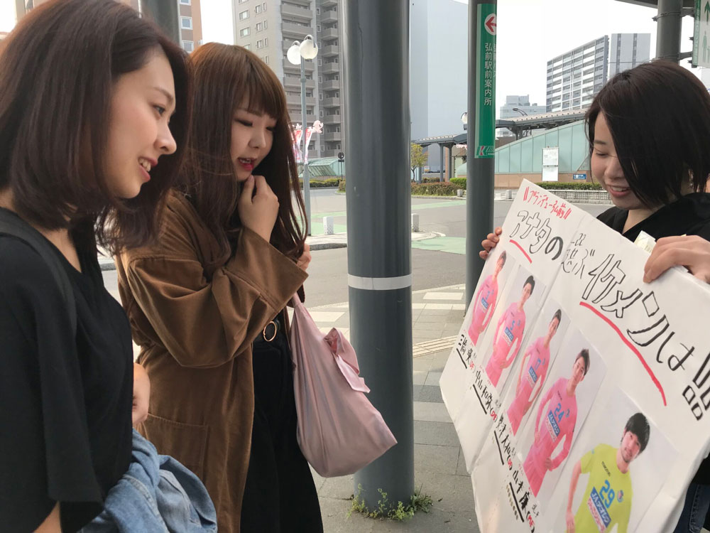 弘前駅にやってきた人々に、ブランデュー弘前のナンバーワンを決めていただきましょう。片っ端から声をかけて、格好いいと思った選手1人にシールを貼ってもらいます!