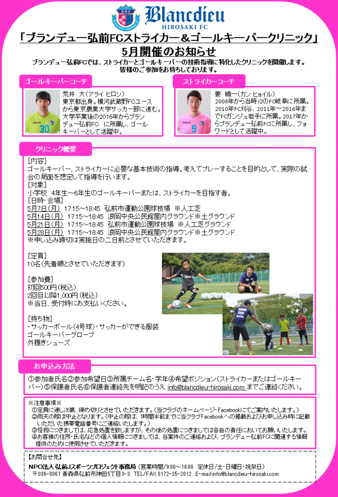 ・はんてんの下に着る物は、ブランデュー弘前FCのユニフォーム・Tシャツまたは、ピンク色の服の着用をお願いします。