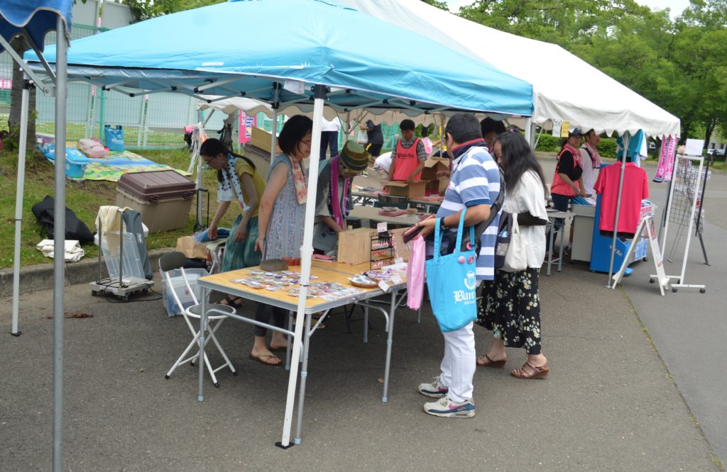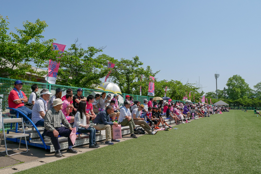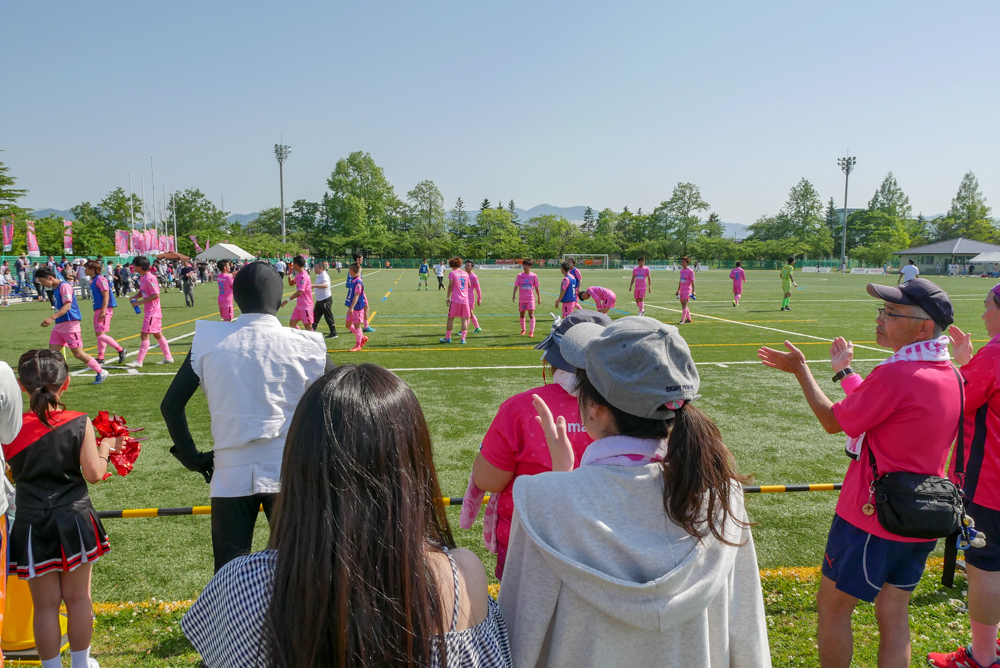 一方、ウルトラスの応援エリアはゴールの後ろ側にある観客席です。ホームである弘前運動公園球技場だと、イベント会場からコートに入ってすぐ見える芝生エリア。ベンチなどはなく、立って応援する方がほとんど。