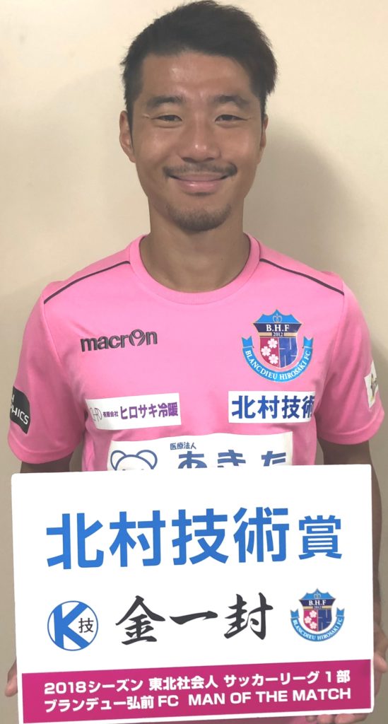 2018シーズン 東北社会人サッカーリーグ1部の試合でブランデュー弘前FCが勝利した場合に、その試合で最も活躍した選手が選出されます。選出された選手には、ブランデュー弘前FCのオフィシャルスポンサー「北村技術株式会社」様より金一封が贈られます。北村技術様、ありがとうございます!