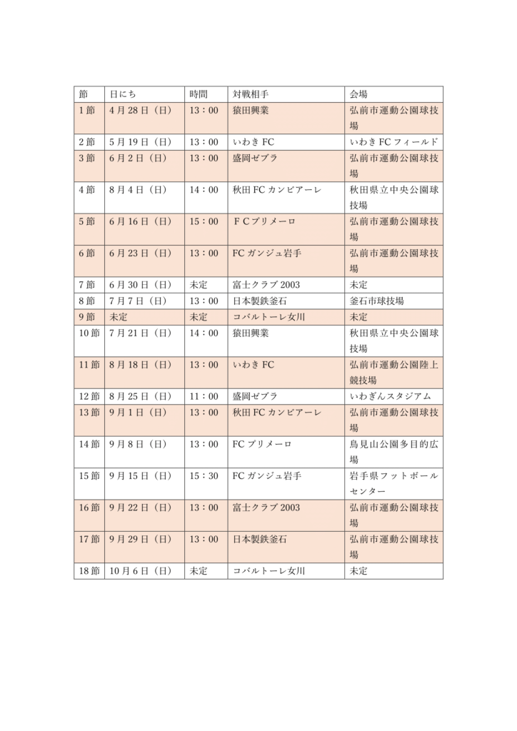 東北社会人サッカーリーグ1部日程表はこちら