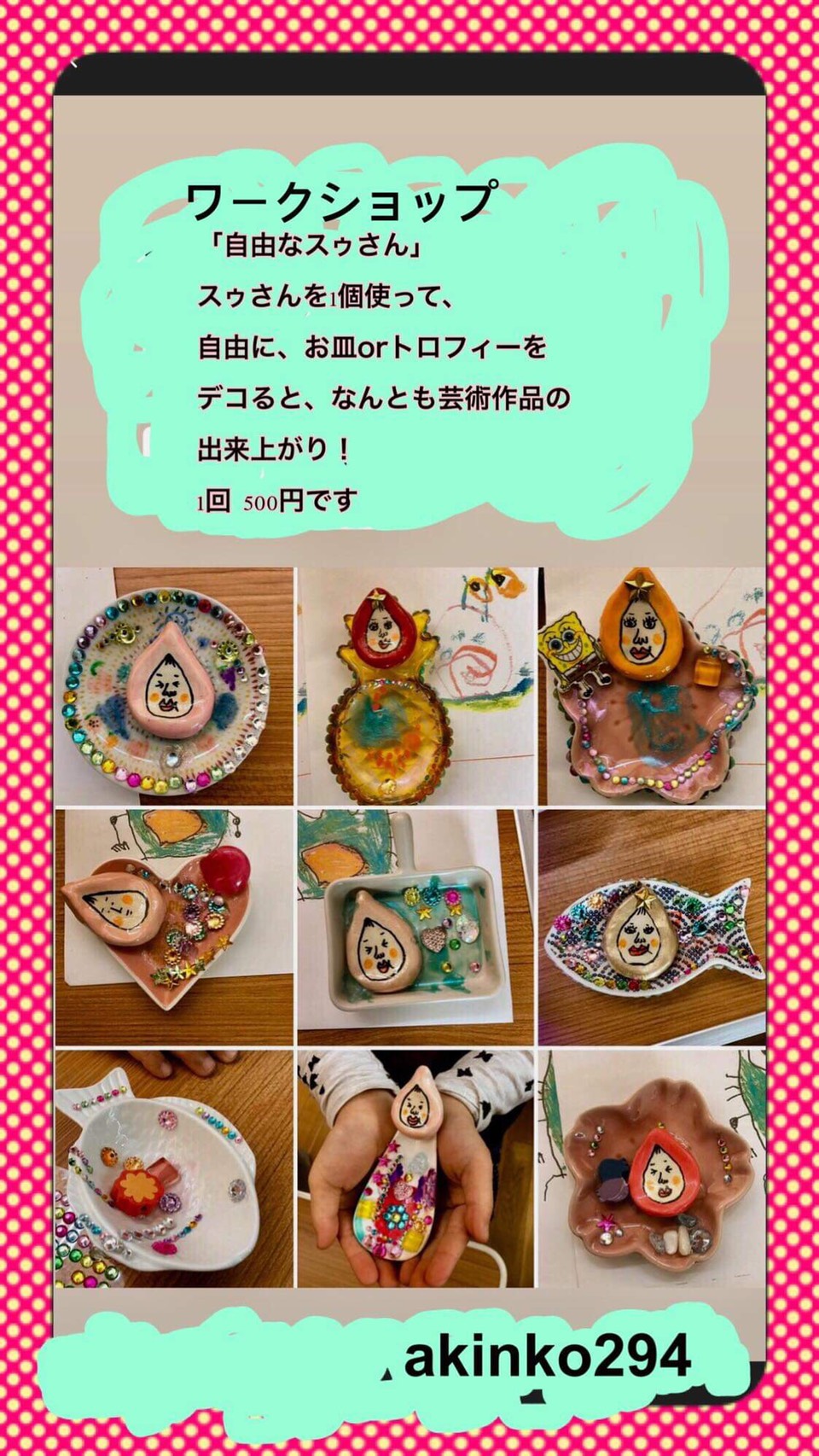 「自由なスゥさん」を1個使って、自由にお皿やトロフィーをデコるワークショップが体験できます!