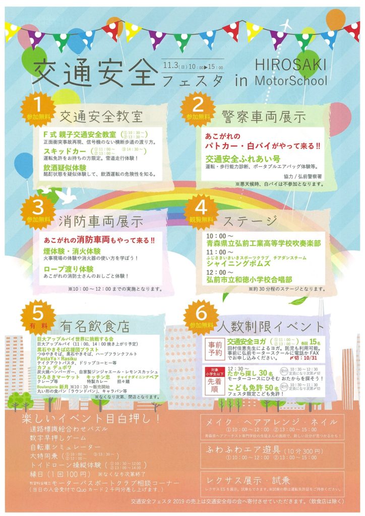 ブランデュー弘前FCのオフィシャルパートナー「株式会社ムジコ・クリエイト 弘前モータースクール」様で開催される「交通安全フェスタ2019」にブラッフェの参加およびキッズパークの出店が決まりましたのでお知らせいたします。皆様のご来場をお待ちしております。