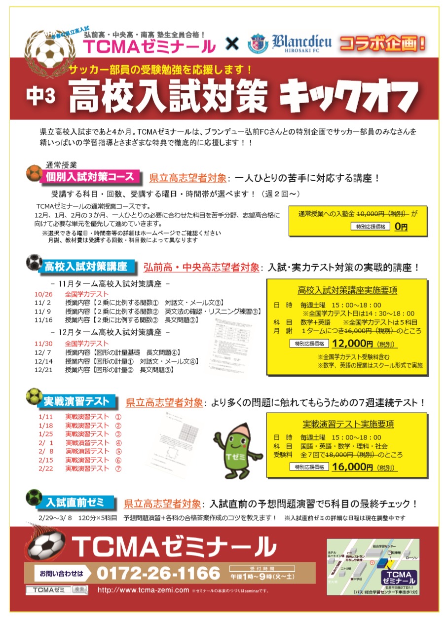 この度、ブランデュー弘前FCではオフィシャルパートナー「TCMAゼミナール」様のご協力のもと、高校入試対策を目的とした特別講習「中3高校入試対策キックオフ」を開催いたします。このサイト・チラシを見た方でサッカー部・サッカークラブに所属していた中学3年生限定で各コースの受験料などが「特別応援価格」で受講することができます。ブランデュー弘前とTCMAゼミナールは、地域の中学生サッカー選手の受験勉強を応援します!