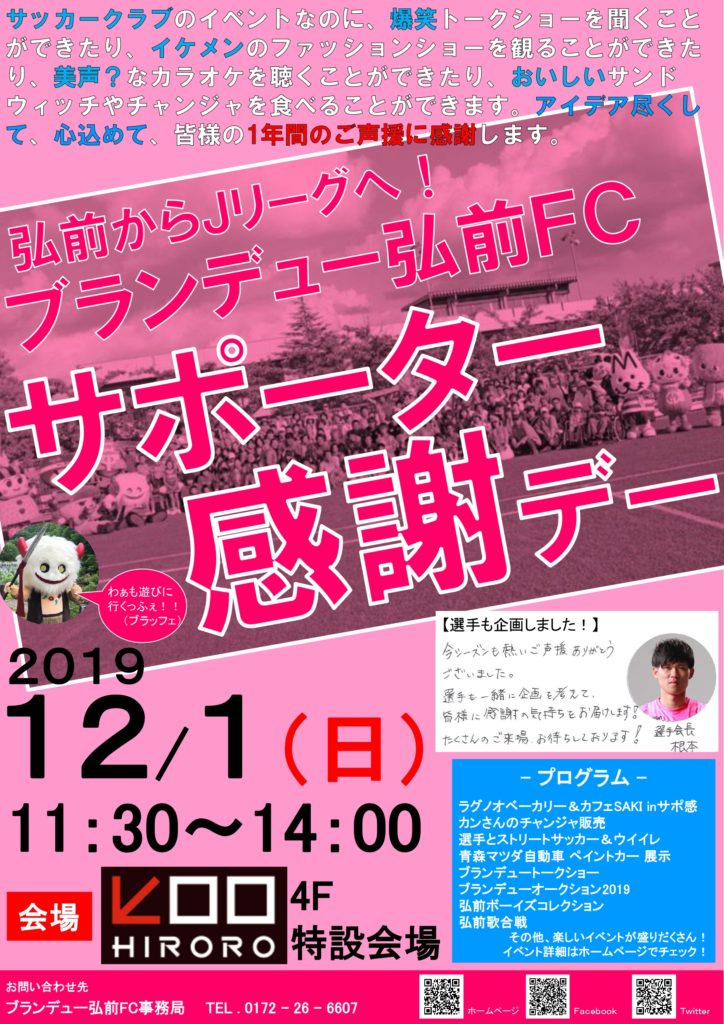 この度、ブランデュー弘前FCでは皆様のご声援に感謝を込めて「2019シーズン サポーター感謝デー」を開催する運びとなりました。詳細は下記の通りとなります。皆様のご来場を心よりお待ちしております。
