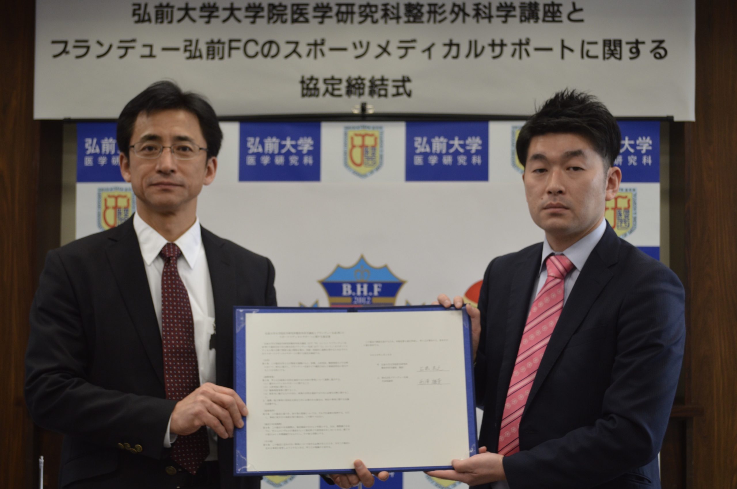 練習と仕事を両立しているため限られた時間で体のケアをしなければならず、スポーツをしている以上ケガも絶えません。弘前大学大学院医学研究科整形外科学講座の皆様には選手がケガをした際に今までもお世話になっておりましたが、Jリーグに参入する際にチームドクターが必要であるという要件があることから今のうちから緊密にサポートをしていただくことと、ケガの予防やリハビリについて選手に対して様々なアドバイスをいただく体制を構築したいという弊クラブの思いと、弘前大学大学院医学研究科整形外科学講座様の地元のチームをサポートしたいという思いが合致し本協定の締結にいたりました。