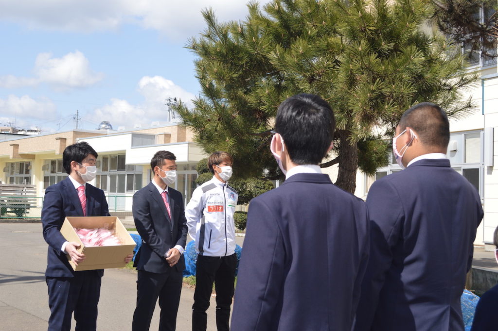4月14日(火)に弘前大学教育学部附属特別支援学校へブランデュー弘前FC特製布マスクの寄付を行い、代表取締役の西澤 雄貴、監督の姜 暁一、浅利 航大選手が参加しました。