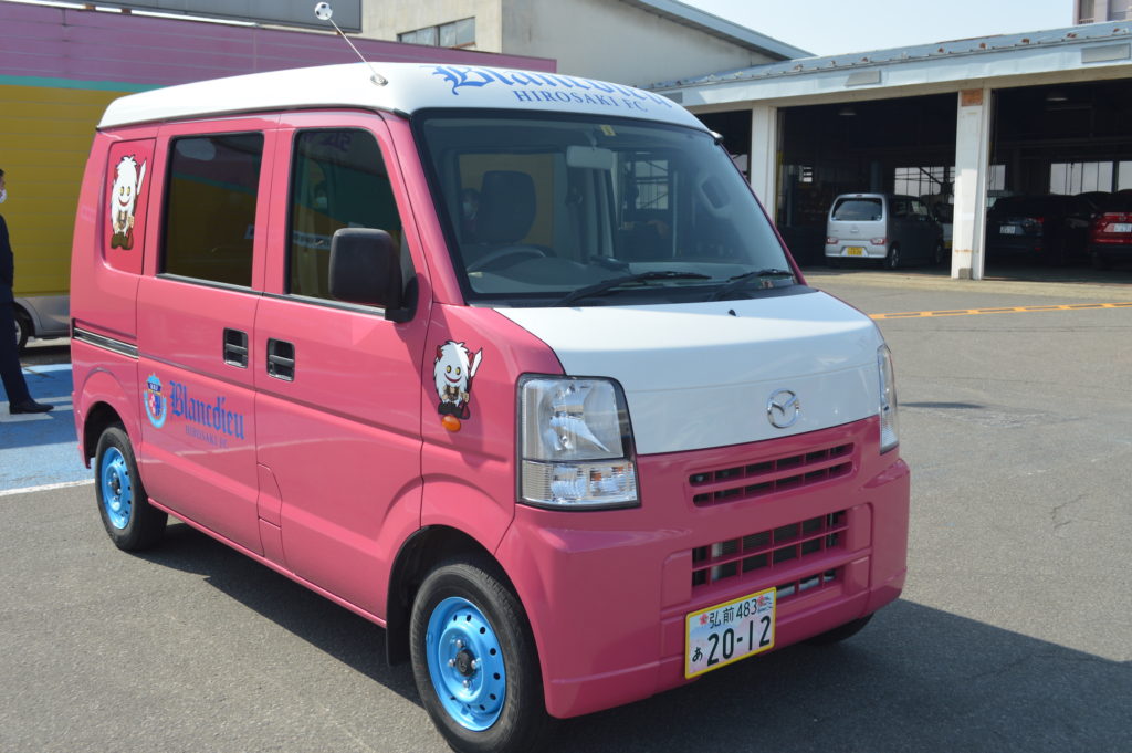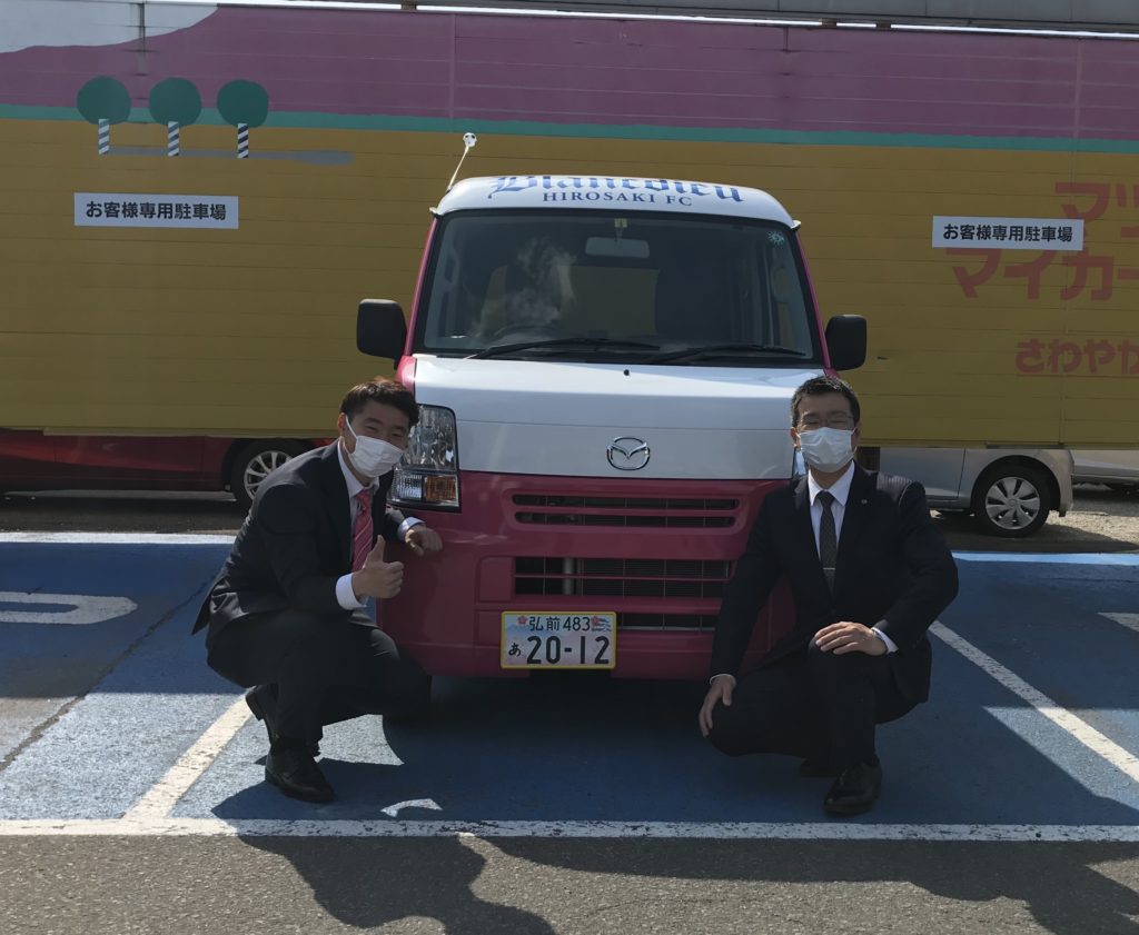 今回、弘前ナンバーの交付開始にあたって、青森マツダ自動車(株)様の「弘前からJ リーグを目指すサッカークラブとして、『弘前ナンバー』をつけた社用車で走り、弘前の魅力を広げてほしい」との思いから「弘前ナンバー」取り付けを実施致しました。
