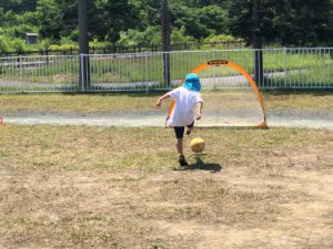 みんな一生懸命ゴールに向かってシュートを打っていました。ボールを思いっきり蹴るって、楽しいね!