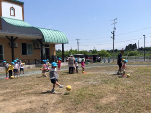 ボールを地面についたり、空に投げたり。「できたー!!」という声が少しずつ聞こえてきました。子供の成長ってすごい!!そしていよいよサッカーへ!みんなでぶつからないように、お散歩ドリブル。