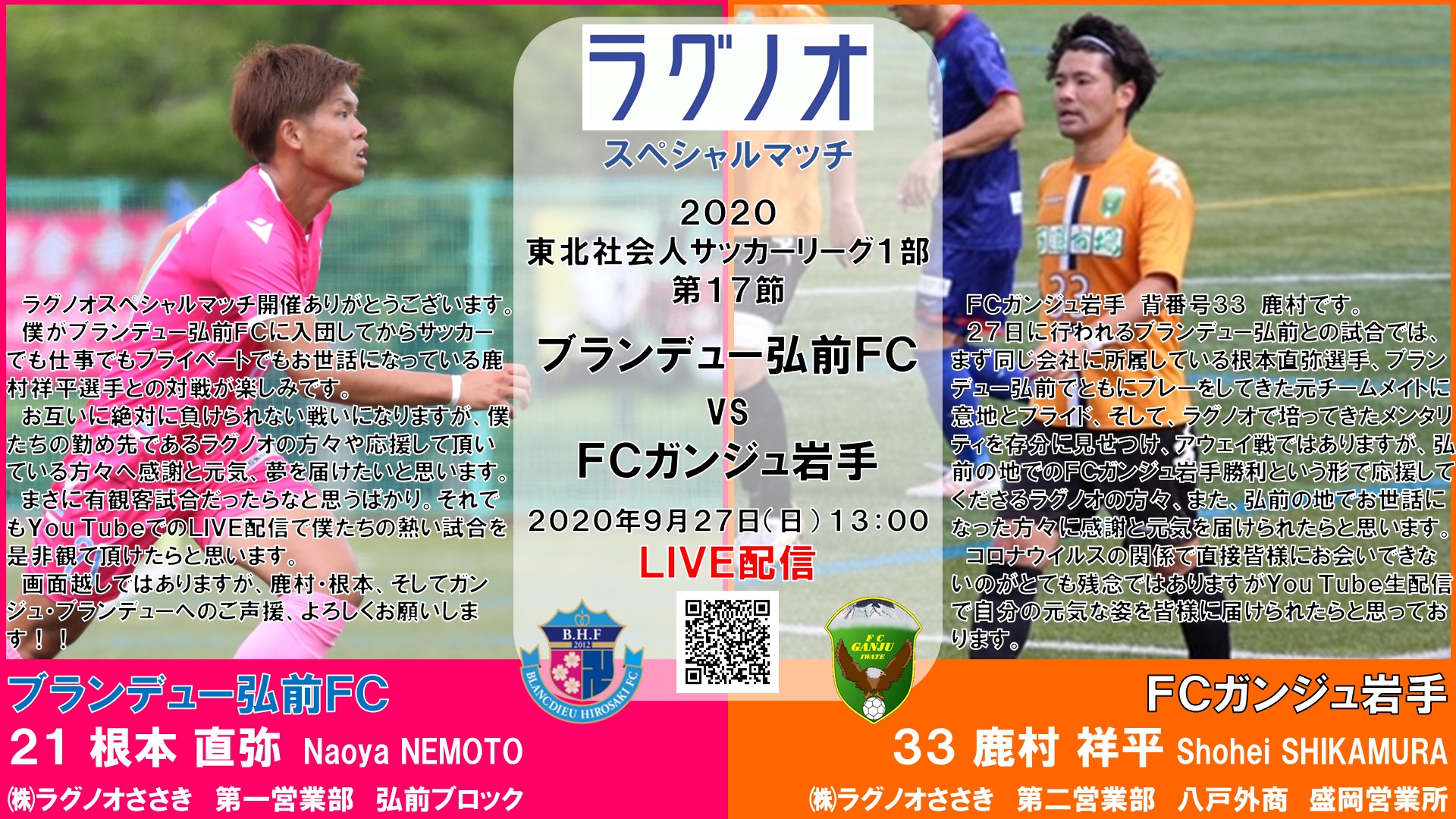 ラグノオ スペシャルマッチ ブランデュー弘前FC vs FCガンジュ岩手の開催に向けて、株式会社ラグノオささきで勤務するブランデュー弘前FC 根本 直弥選手とFCガンジュ岩手 鹿村祥平選手からメッセージをいただきました。