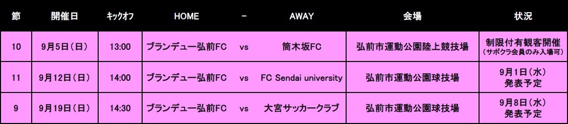 ブランデュー弘前FCが所属する東北社会人サッカーリーグでは、東北各地において、緊急事態宣言・まん延防止措置・県独自の感染対策等が発令されている状況を考慮し、9月5日(日)・12日(日)に開催予定のリーグ全試合を中止(延期)とすることが決定しましたのでお知らせいたします。