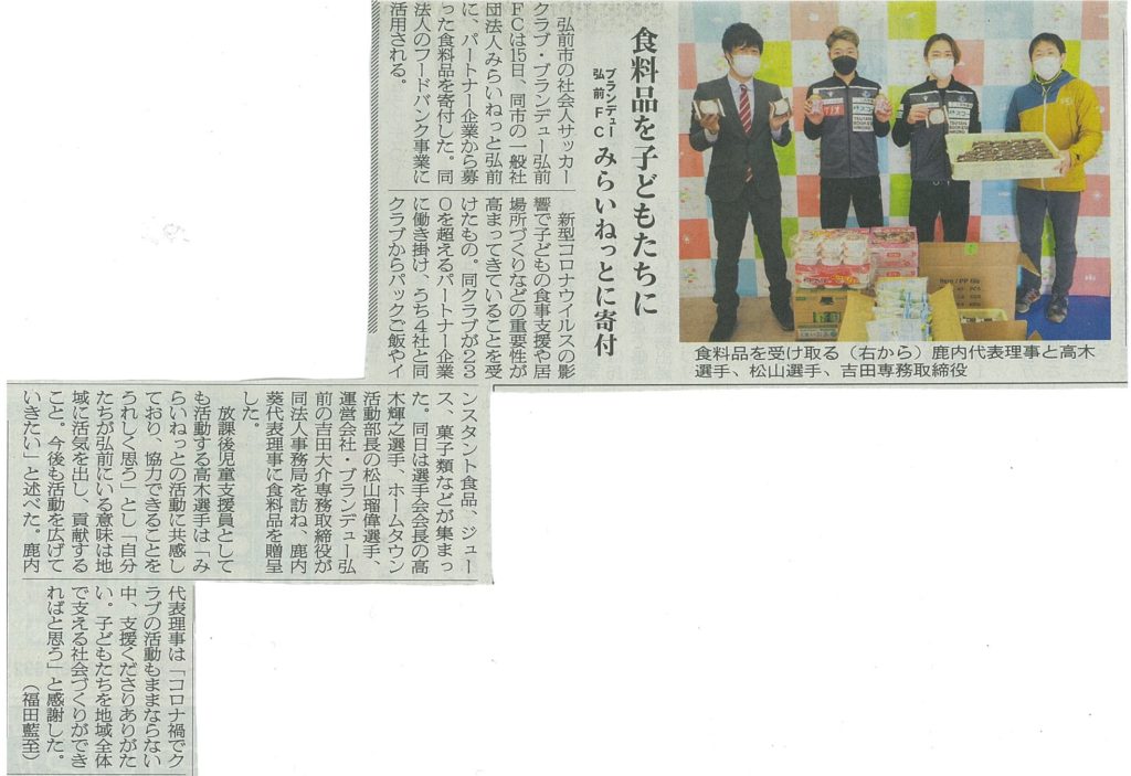 みらいねっと弘前様「フードバンク事業」協力についての記事が下記の通り掲載されましたのでお知らせします。
