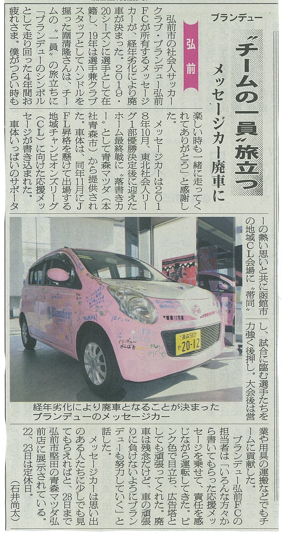 そして2019年春、青森マツダ自動車㈱様より弊クラブにメッセージカーを寄贈していただいております。その後、メッセージカーは時にはクラブの営業車として、時にはチームの用具車として、大車輪の活躍をしてくれました。