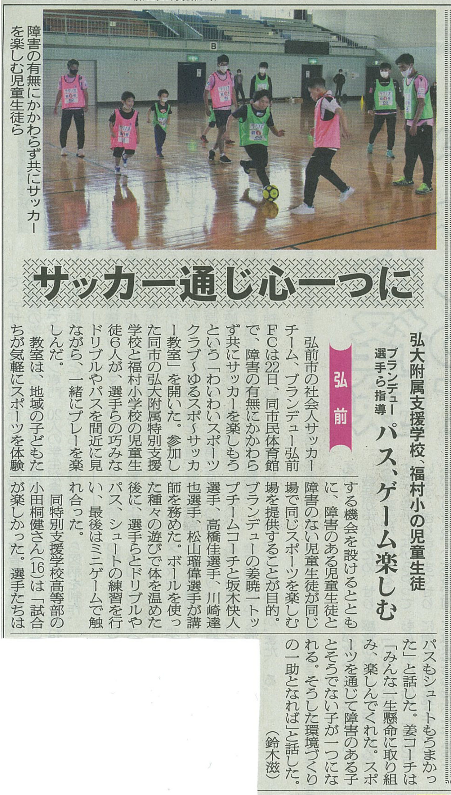 今回のサッカー教室は、障がいのある人と障がいのない人が共にスポーツを楽しむスポーツ教室で、令和4年度スポーツ庁委託事業「障がい者スポーツ推進プロジェクト」の一環として、中南地区及び浪岡地区の小・中学校在籍児童生徒を対象に行われているものです。