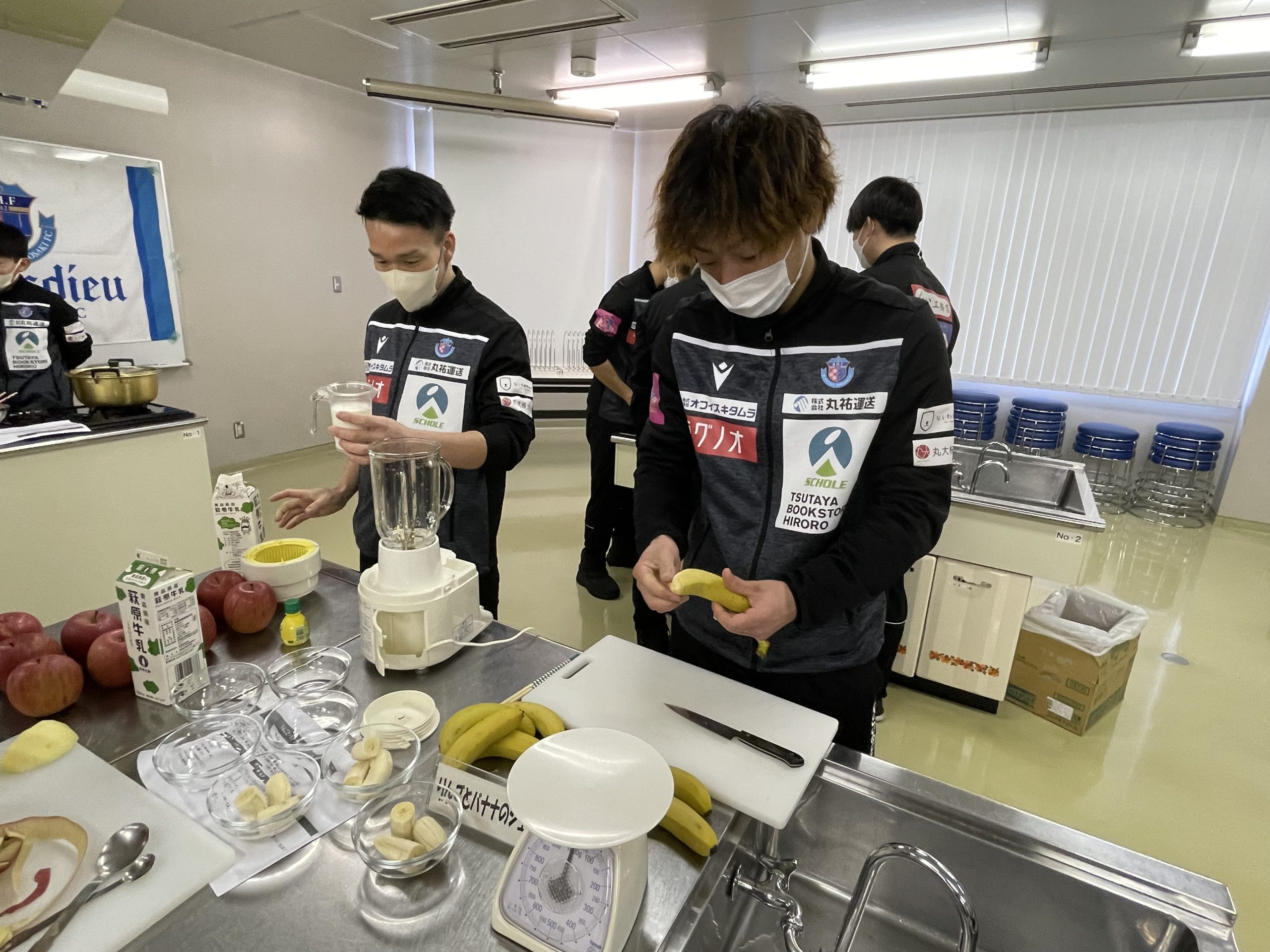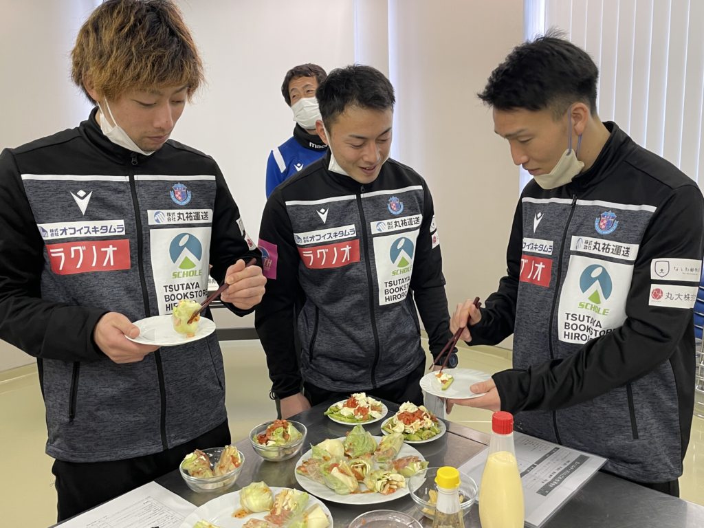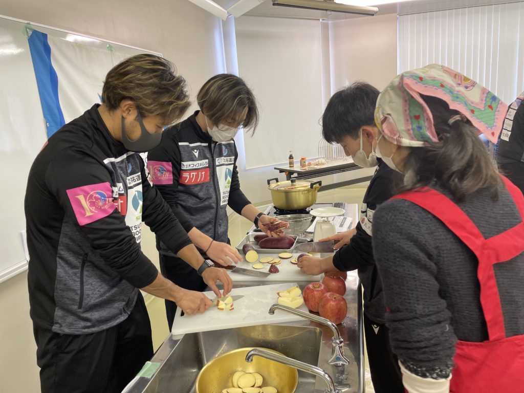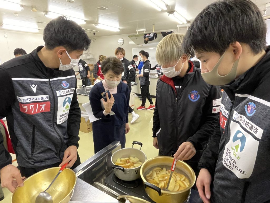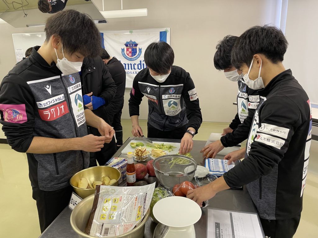2回目は、選手が7チームに分かれて前回の橋本 玲子先生のセミナーで学んだことを取り入れながら「青森りんごを使用した補食」を各チームで1品考案・調理し「スポーツ場面で役に立つ果物の補食コンテスト」を開催いたしました。