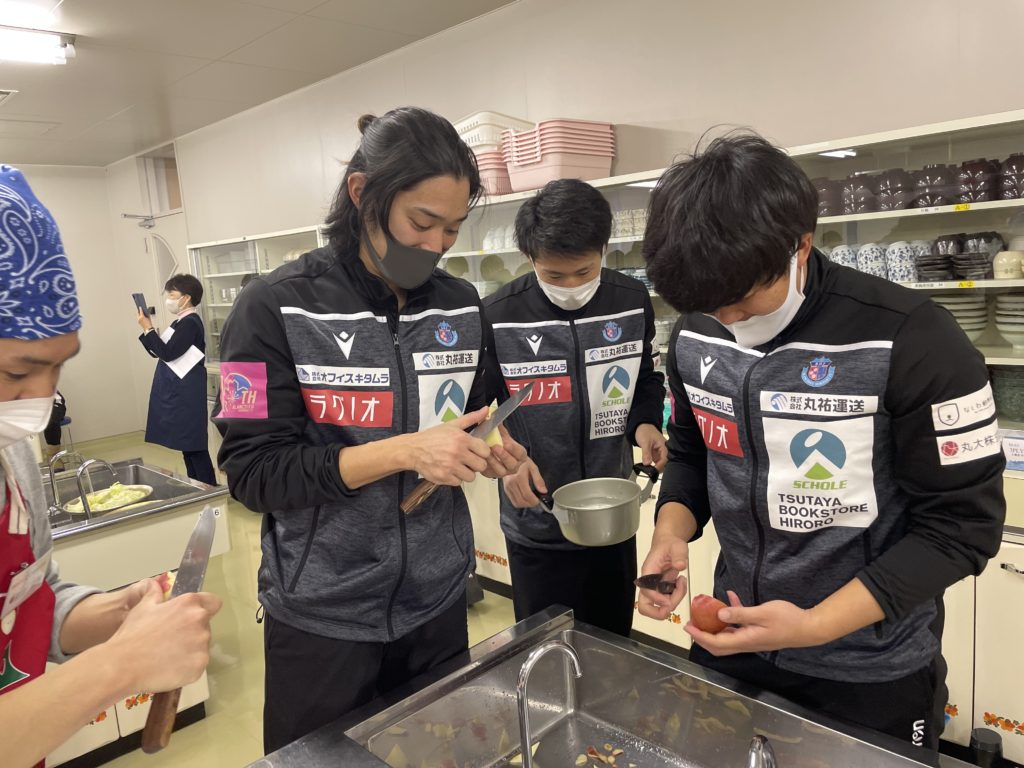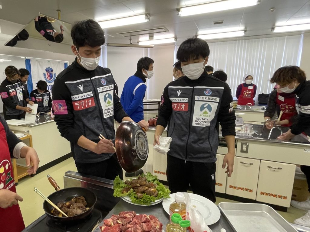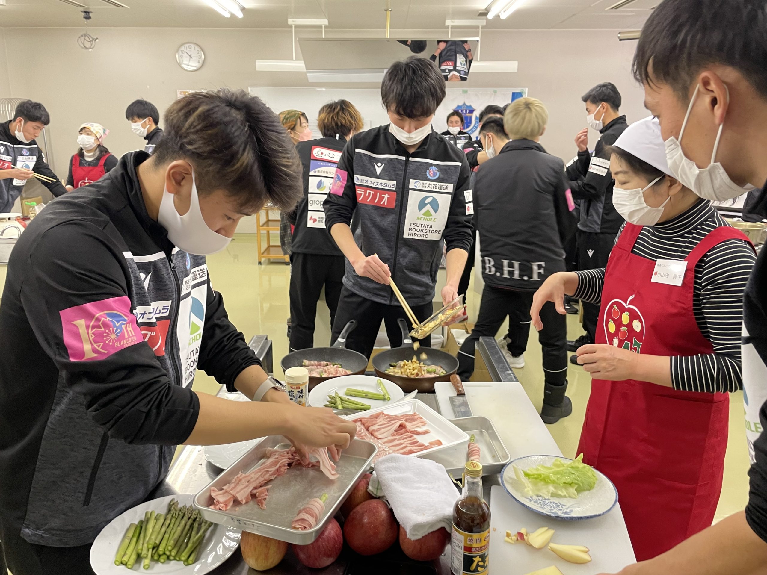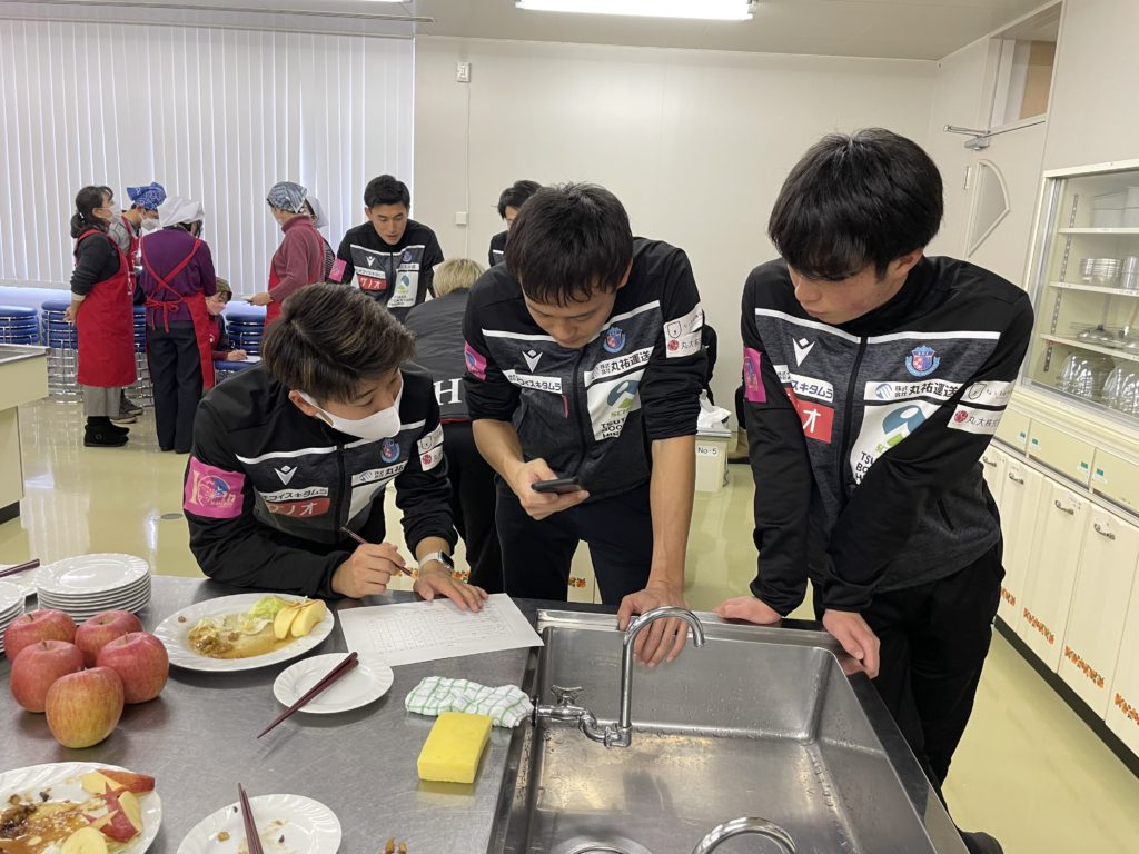 2回目は、選手が7チームに分かれて前回の橋本 玲子先生のセミナーで学んだことを取り入れながら「青森りんごを使用した補食」を各チームで1品考案・調理し「スポーツ場面で役に立つ果物の補食コンテスト」を開催いたしました。