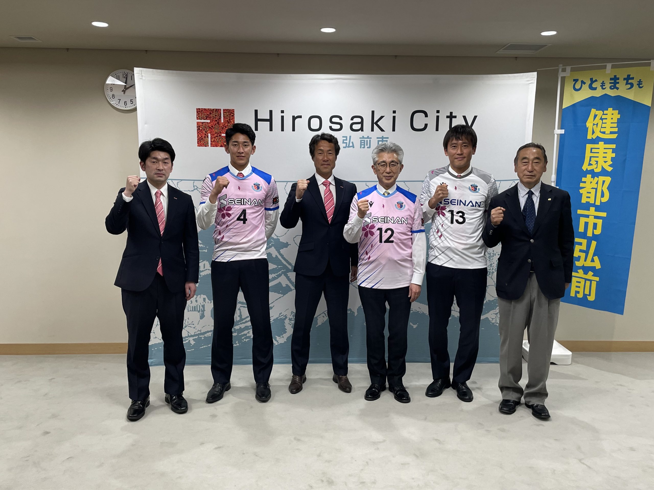 表敬訪問には、株式会社ブランデュー弘前 代表取締役 西澤 雄貴・弘前サッカー協会 会長 廣谷 滋・トップチーム監督 山本 富士雄・ キャプテン 川﨑 達也選手・ 弘前市出身 成田 諒介選手が参加しました。