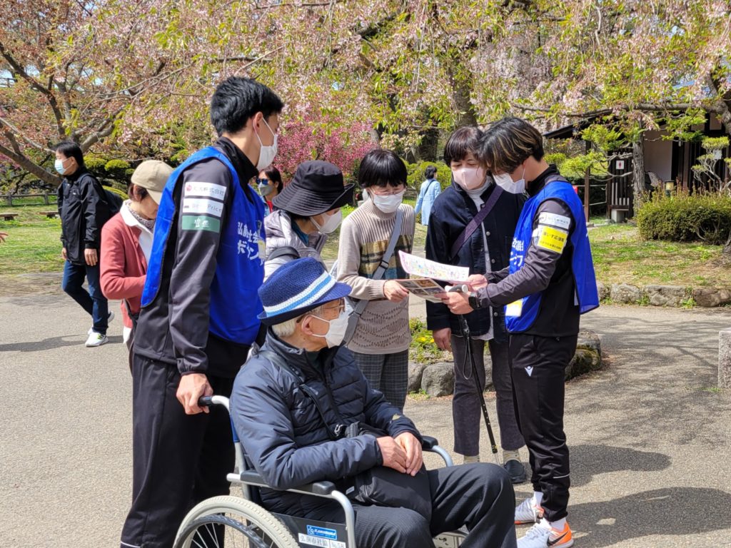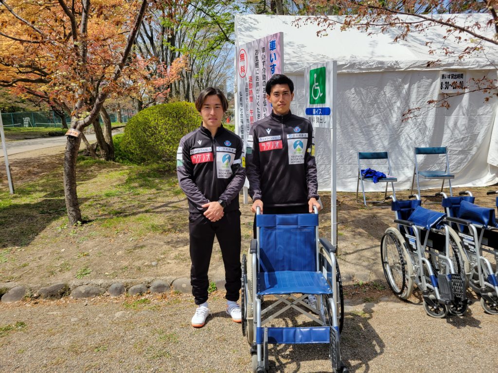 当日は、坂木 快人選手・高木 輝之選手・スタッフが弘前公園での車いすの介助や貸出業務などをお手伝いさせていただきました。