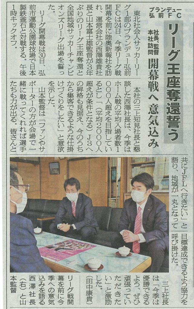 当日はブランデュー弘前FCの㈱ブランデュー弘前 代表取締役 西澤 雄貴・トップチーム監督 山本富士雄が㈱陸奥新報社 代表取締役社長 三上 知見様を訪問しました。