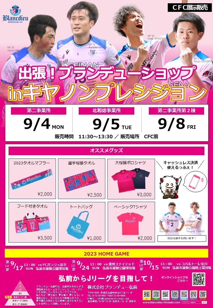 ブランデュー弘前FCでは、キヤノンプレシジョン北和徳事業所・第二事業所・第二事業所2棟の3か所にて「出張!ブランデューショップ」を実施しましたので、ご報告いたします。