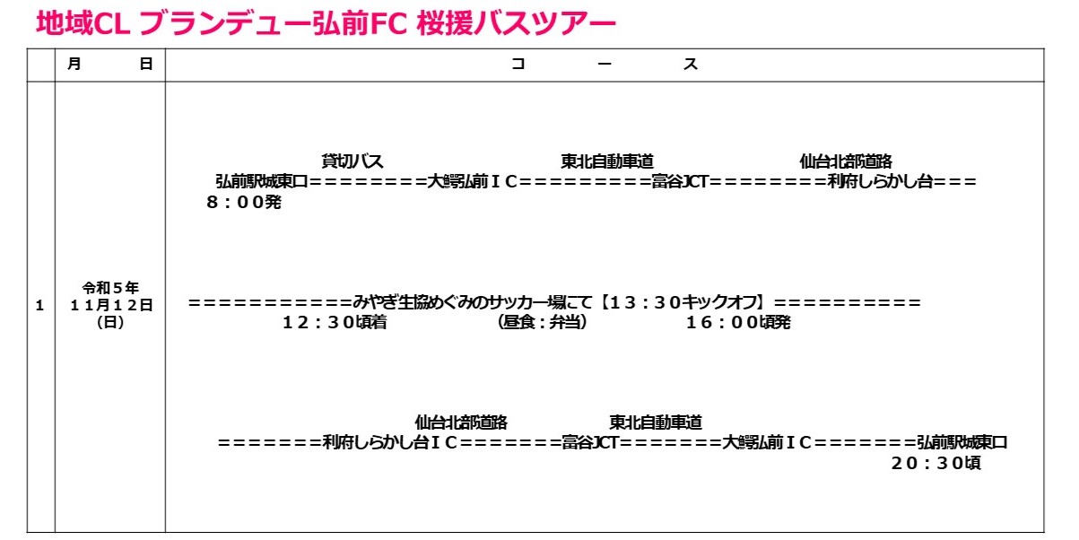 この度ブランデュー弘前FCでは、11月12日(日)みやぎ生協めぐみ野サッカー場で開催される全国地域サッカーチャンピオンズリーグ2023 3試合目 vs 福山シティFC戦において「ブランデュー弘前FC 桜援バスツアー」を実施することとなりましたので、お知らせいたします。