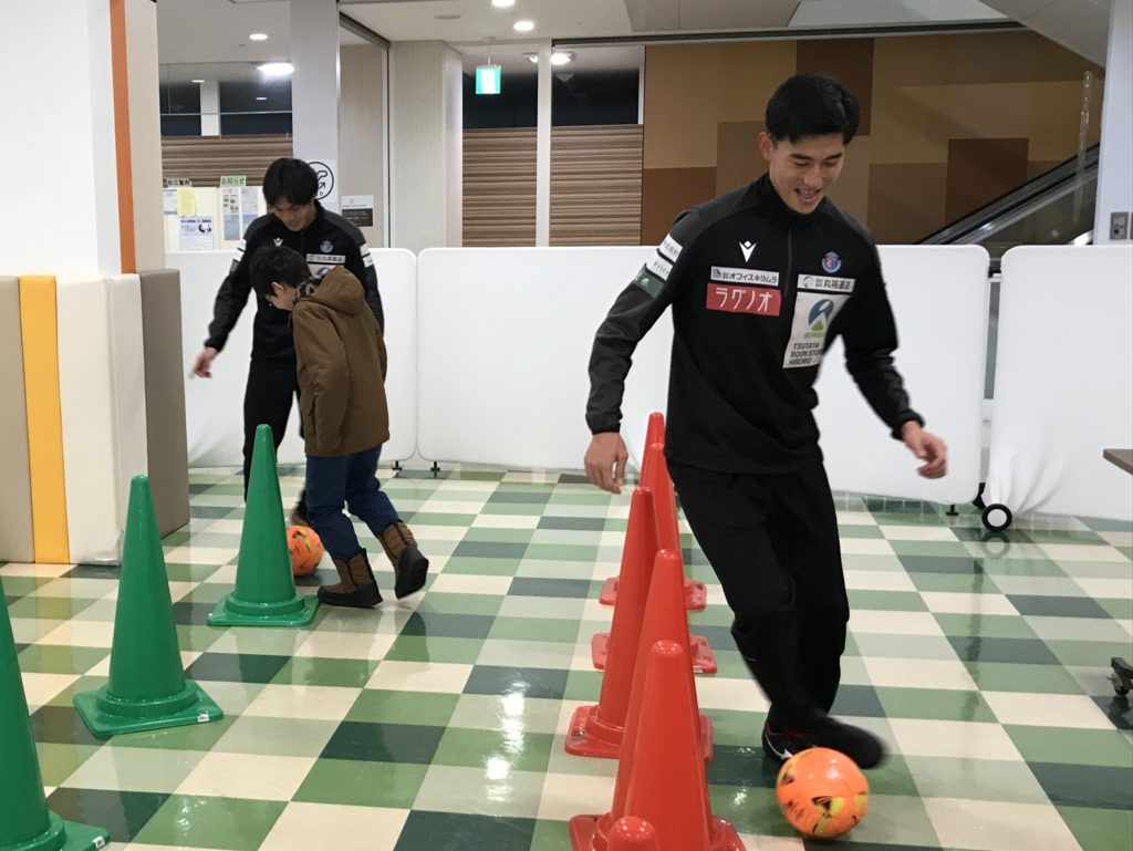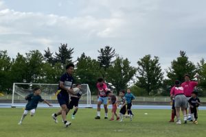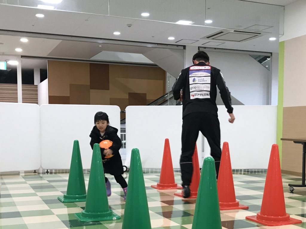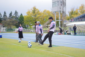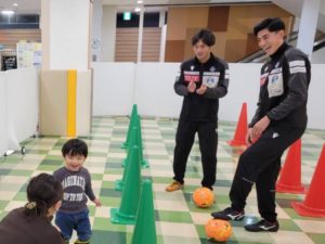 ブランデュー弘前FCからは、坂木 快人選手・繁田 康平選手・ブラッフェが参加し、サッカーコーナー「ブランデュー弘前FC 選手と1対1ドリブル対決!」で選手と一緒に楽しめるアトラクションを実施いたしました。参加してくれた多くの方はサッカー未経験とのことでしたが、元気いっぱい一生懸命に取り組んでいました。