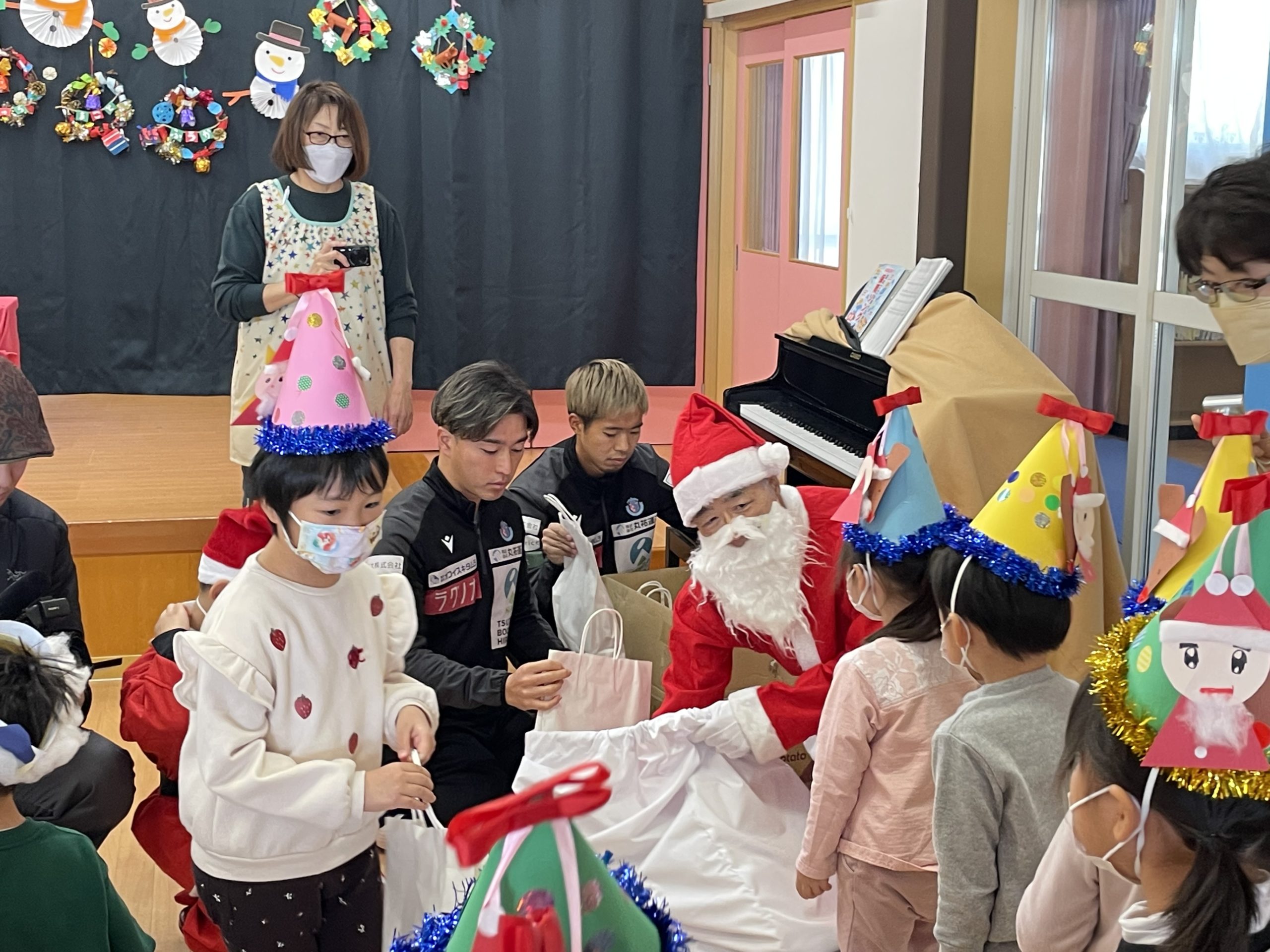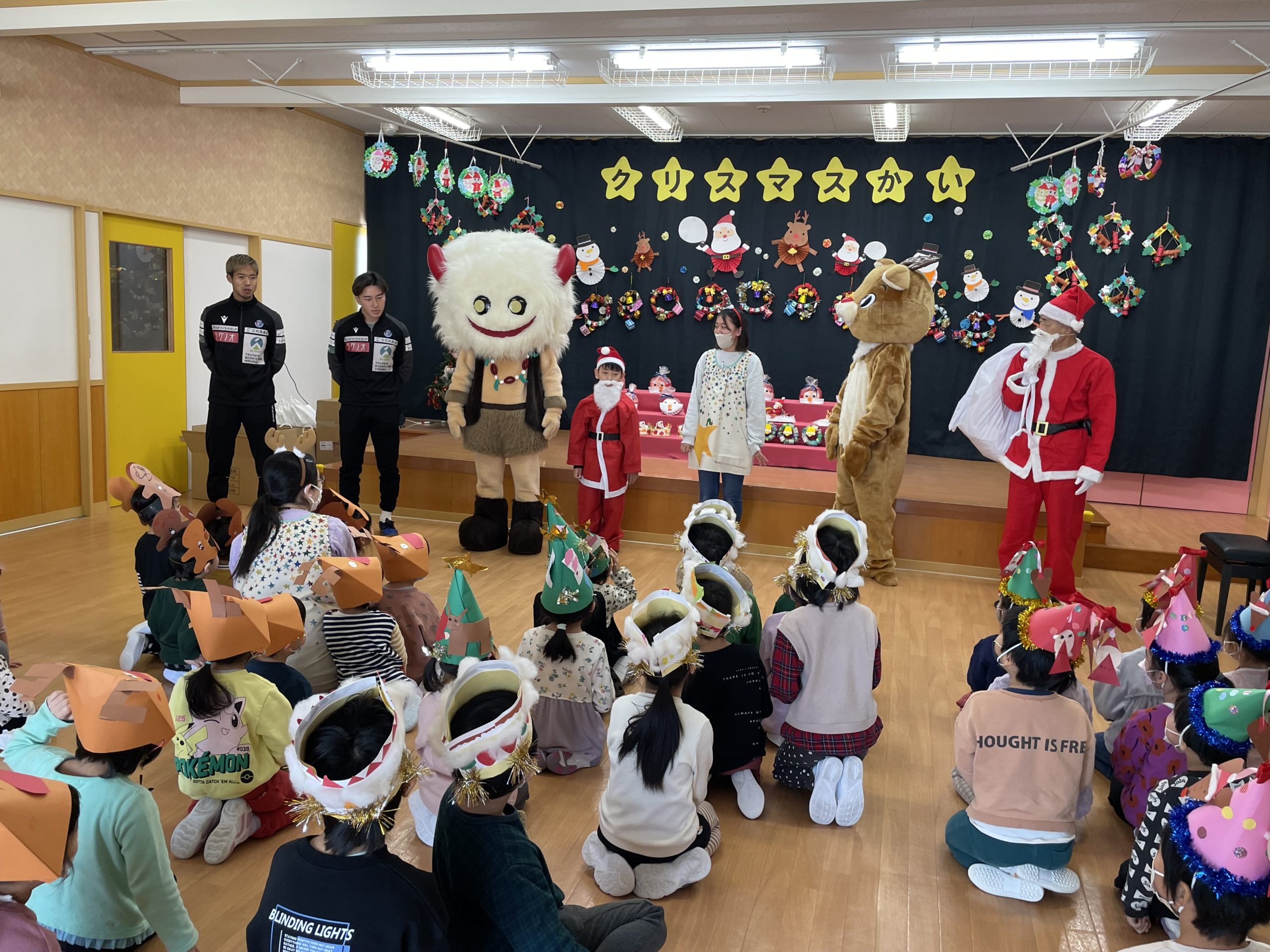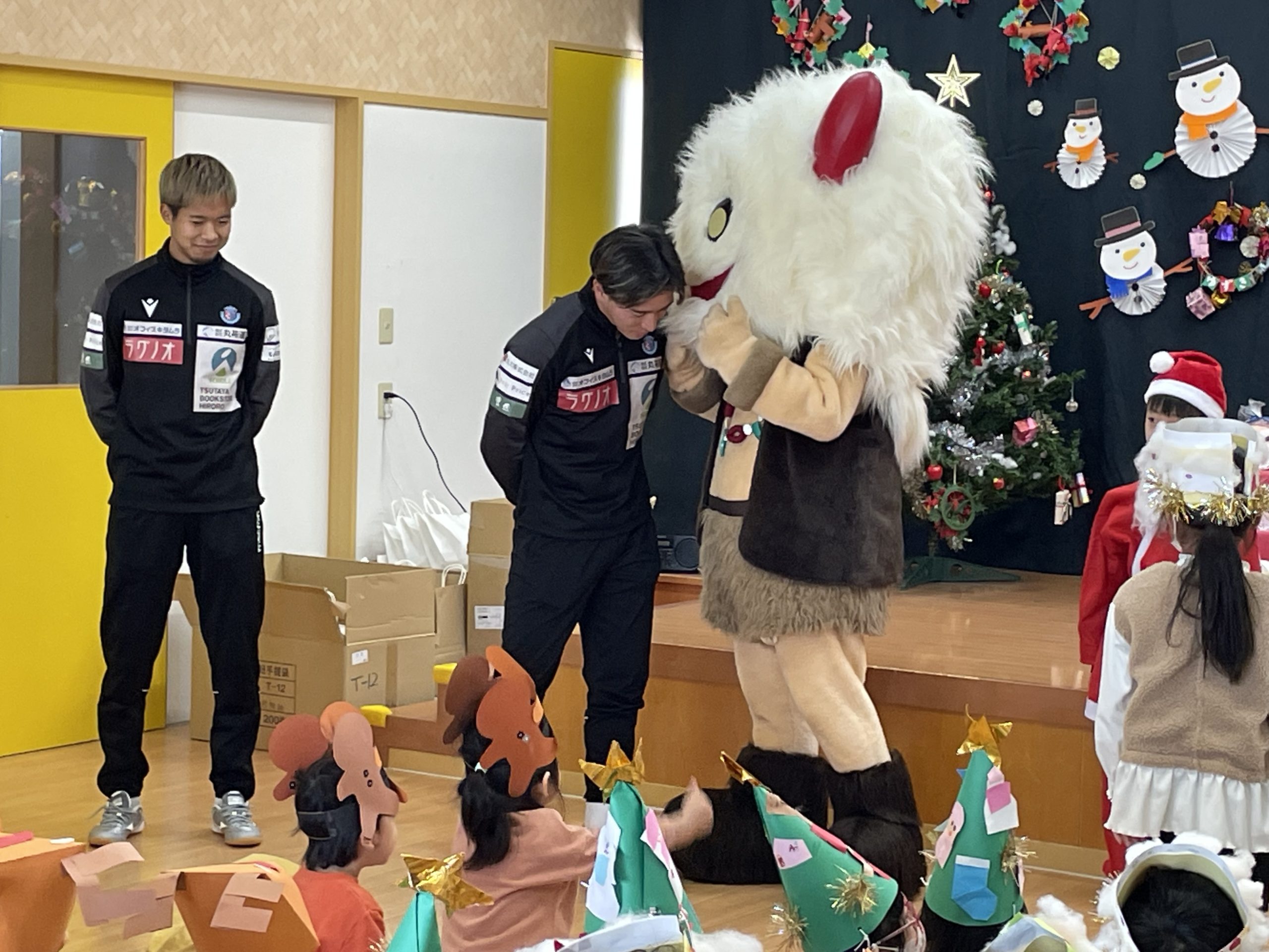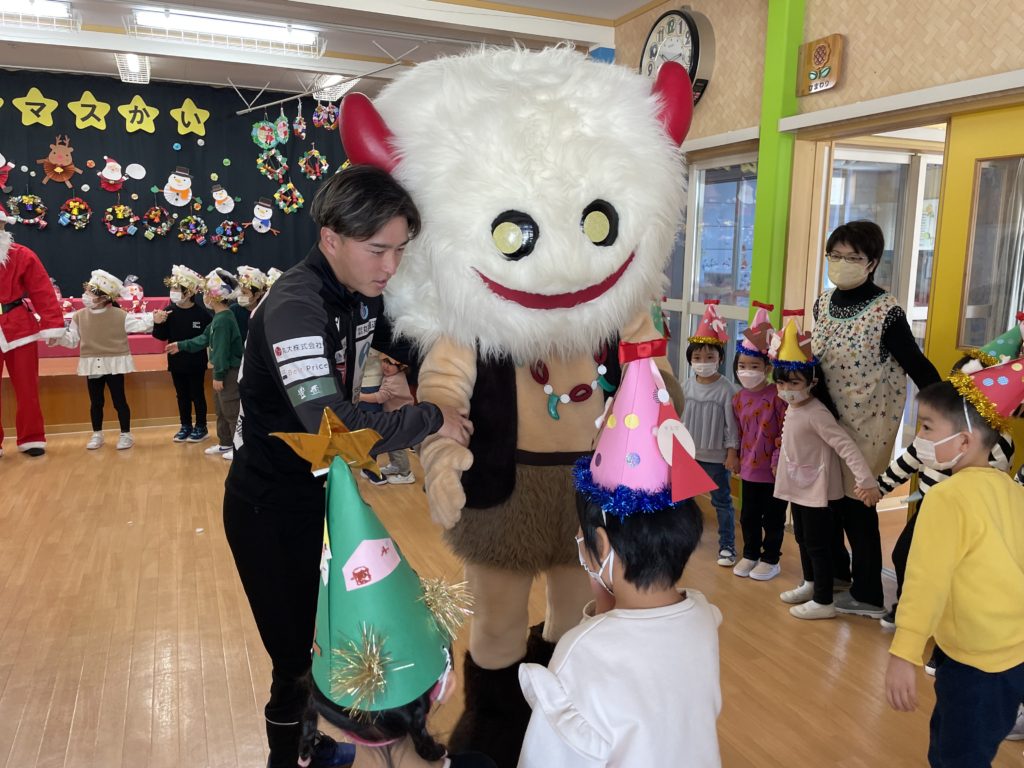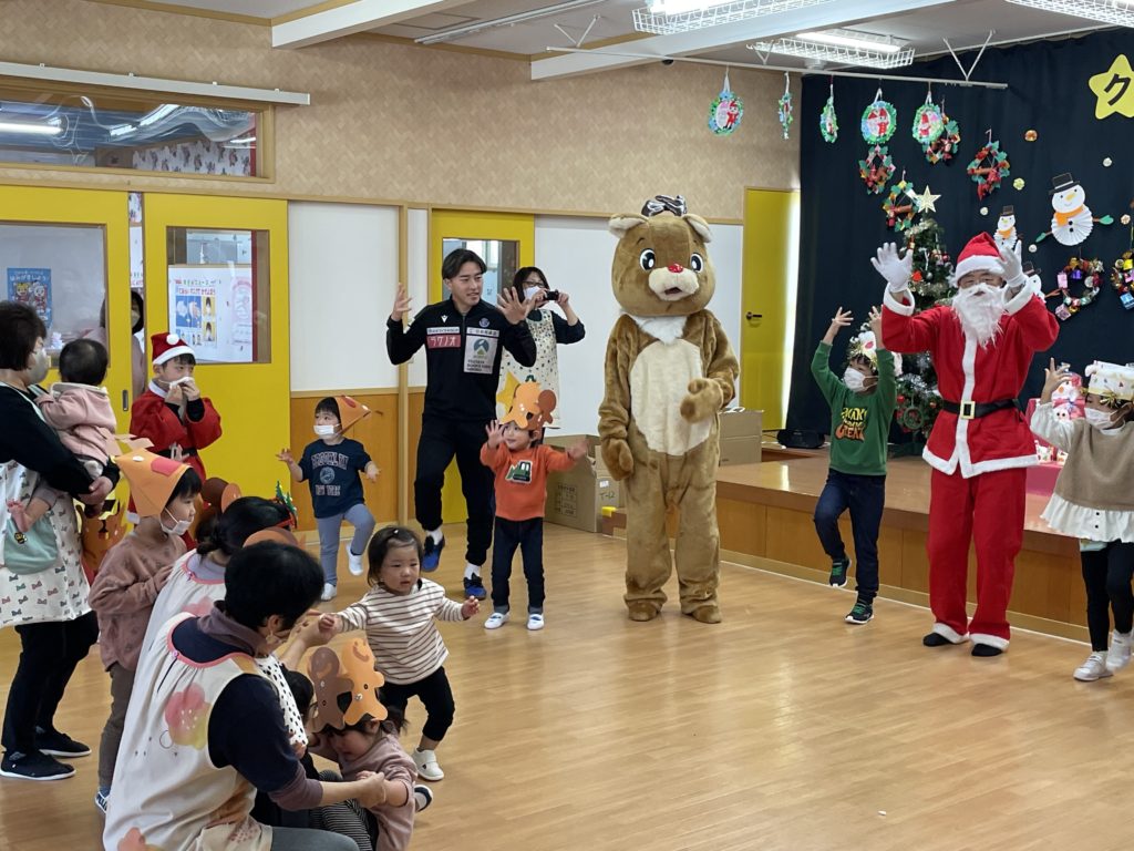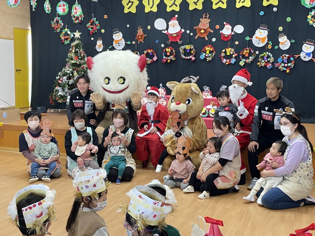 本日、12月25日(月)「社会福祉法人 東豊福祉会 認定新里こども園」にて開催されたクリスマス会に、㈱丸祐運送様で勤務する浅利 航大選手と高木 輝之選手、ブラッフェが参加させていただきました。イベントにはサンタクロースとトナカイも参加し、子どもたちと一緒にクリスマスの曲に合わせて歌やダンスを楽しみ笑顔あふれるクリスマス会となりました。素敵なクリスマスをありがとうございました!