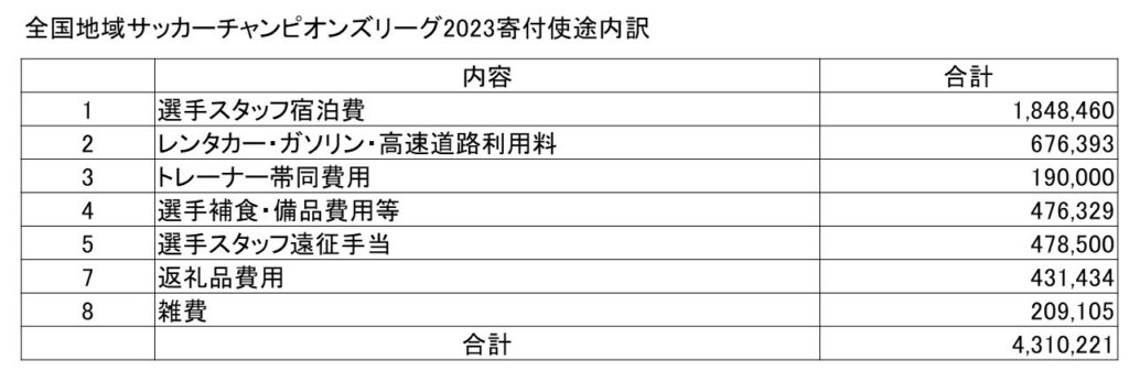 なお、全国地域サッカーチャンピオンズリーグ2023 遠征費寄付金へ皆様より暖かいご支援を賜りました寄付金は、その意向に沿い充当させていただきました。皆様のご厚意に改めて感謝申し上げるとともに、ご報告させていただきます。