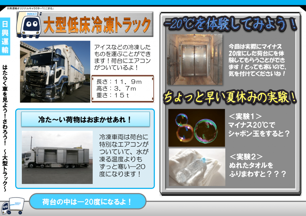 大型冷凍トラックへの乗車ができ、荷台では、-20℃の世界を体験できます♪