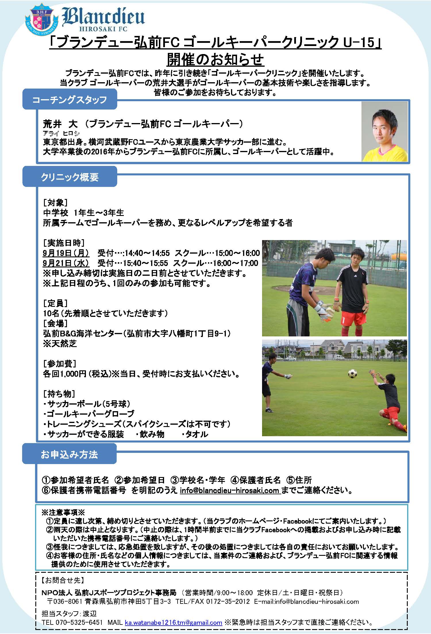 ブランデュー弘前FCゴールキーパークリニック U-15開催のお知らせ