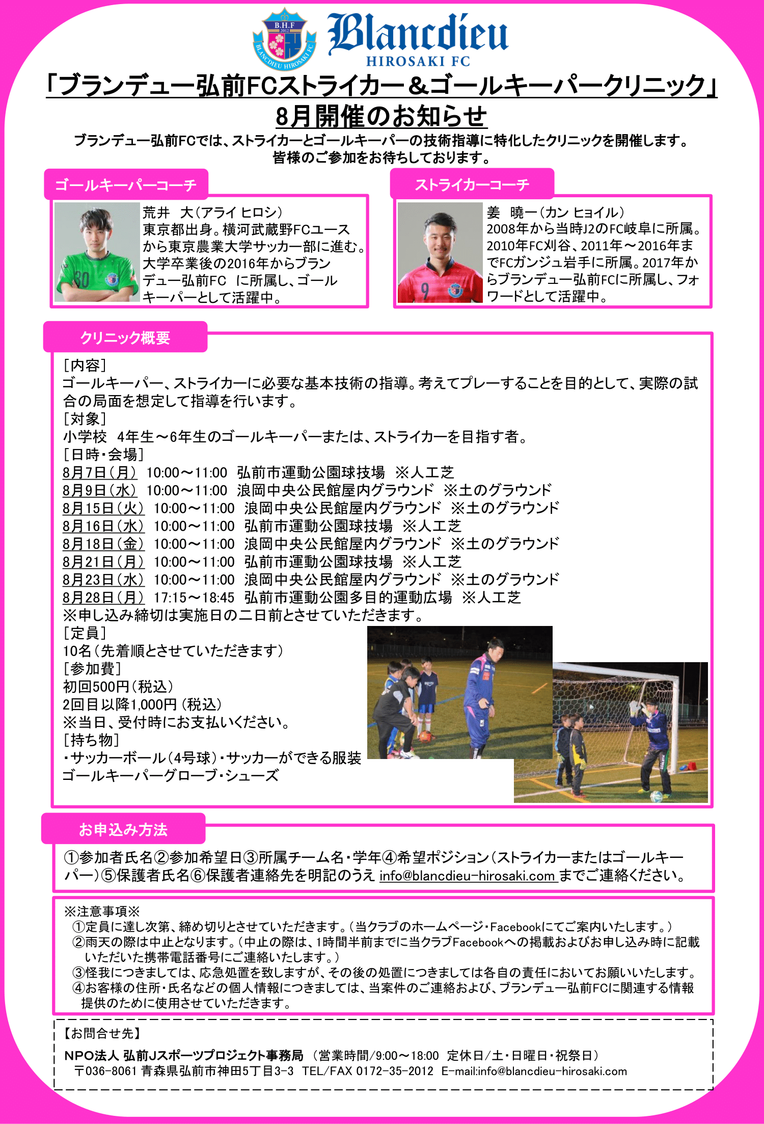 この度、ブランデュー弘前FCでは、小学校4年生から6年生を対象に開催している「ブランデュー弘前FCストライカー&ゴールキーパー クリニック」の8月開催日程が決定しましたのでお知らせいたします。