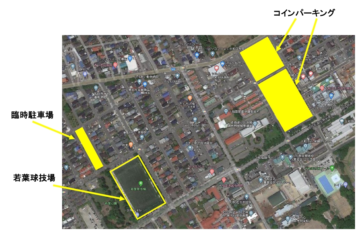 また、会場となる十和田市若葉球技場へお車でお越しの際、駐車場は
