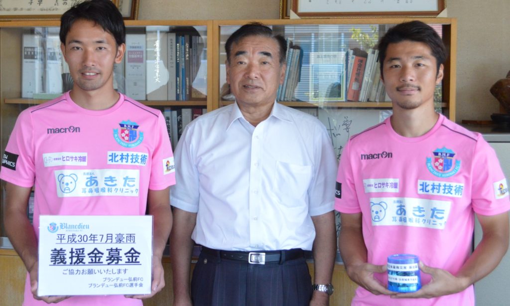この度、ブランデュー弘前FCでは、ホームゲーム等で実施いたしました「平成30年7月豪雨」に対する義援金募金においてお寄せいただいた寄付全額と、ブランデュー弘前FCでお預かりしておりました「まなびの森 弘前城東予備校」の講師様・学生様による寄付全額を、弘前市社会福祉協議会にお渡しさせていただきましたのでご報告いたします。