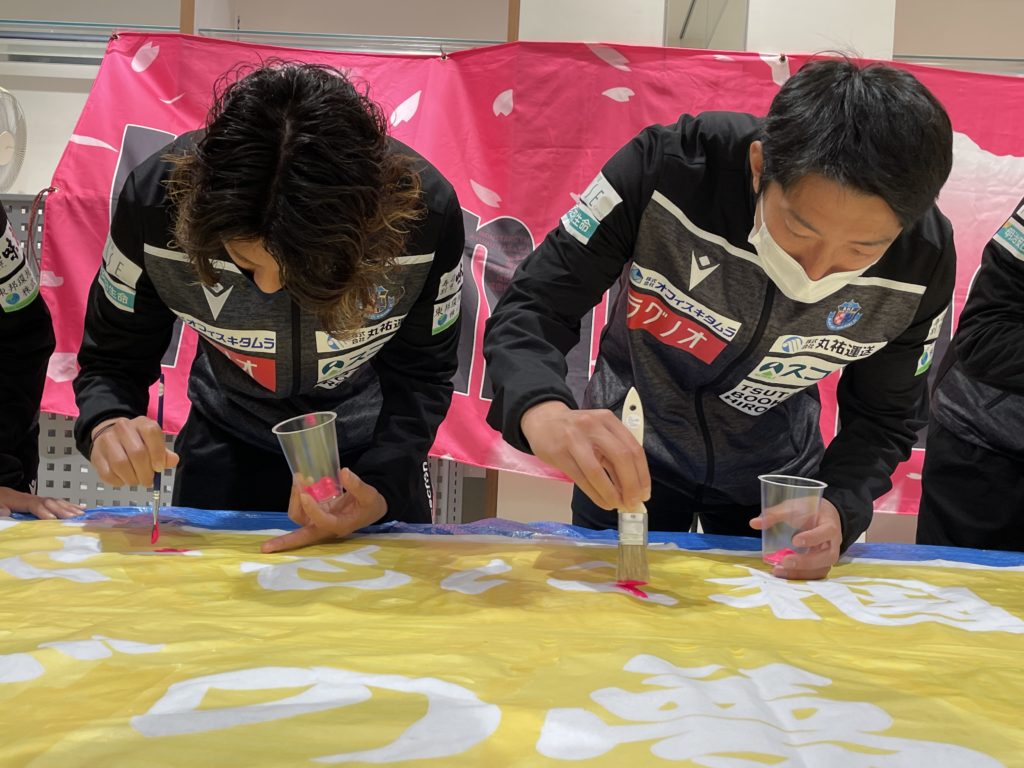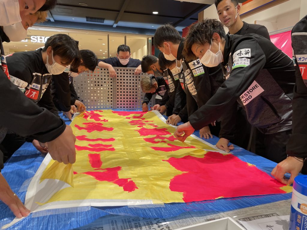 選手とサポーターが一緒になり、来シーズンの応援横断幕を製作。選手たちは横断幕を作る大変さを実感していました!サポーターの皆様、いつもありがとうございます!