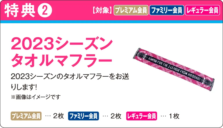 今年は試合会場を桜色で染めるべく会員特典に「2023シーズン タオルマフラー」をご用意させていただきました!そのため大変心苦しいお願いとなりますが、 価格を改定させていただく事となりました。ただし昨年よりもお得な特典内容になっております!
