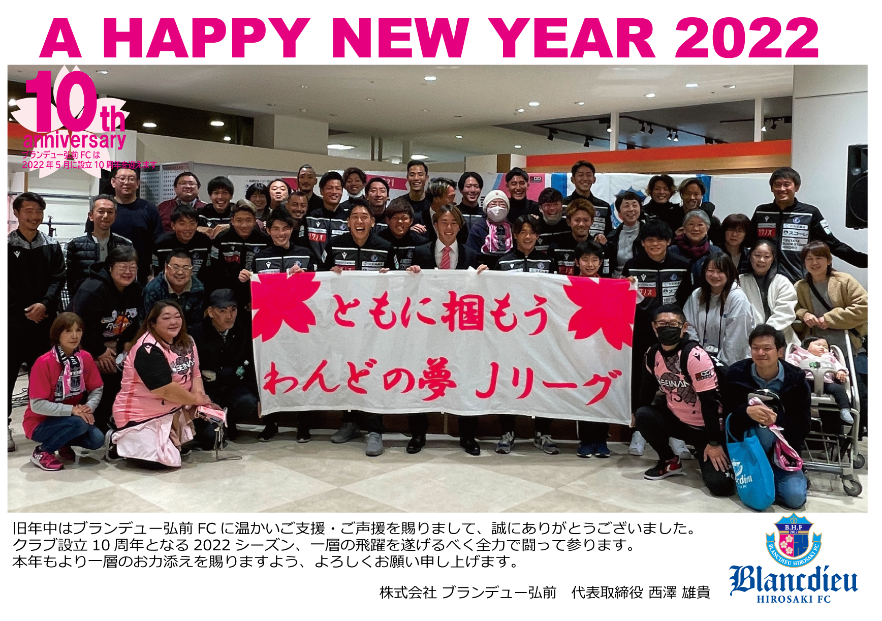 あけましておめでとうございます クラブ2022.01.1 旧年中はブランデュー弘前FCに温かいご支援・ご声援を賜りまして、誠にありがとうございました。 クラブ設立10周年となる2022シーズン、一層の飛躍を遂げるべく全力で闘って参ります。 本年もより一層のお力添えを賜りますよう、よろしくお願い申し上げます。 メディア掲載のお知らせメディア出演のお知らせ
