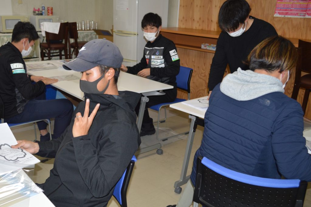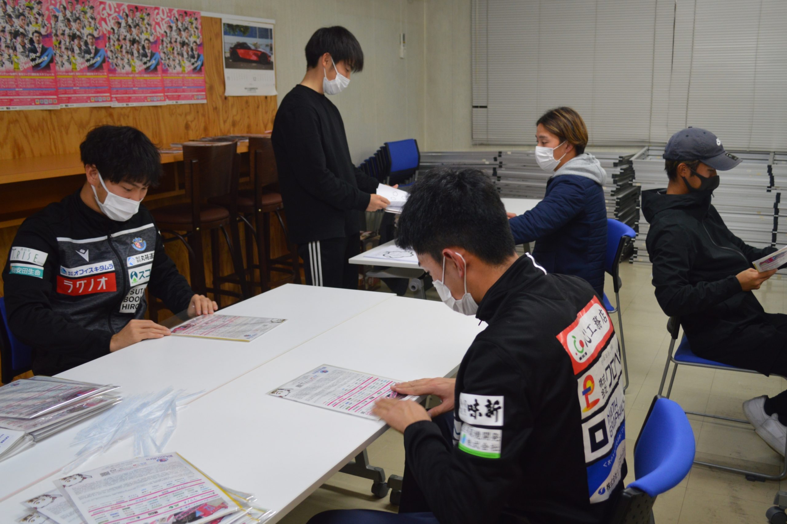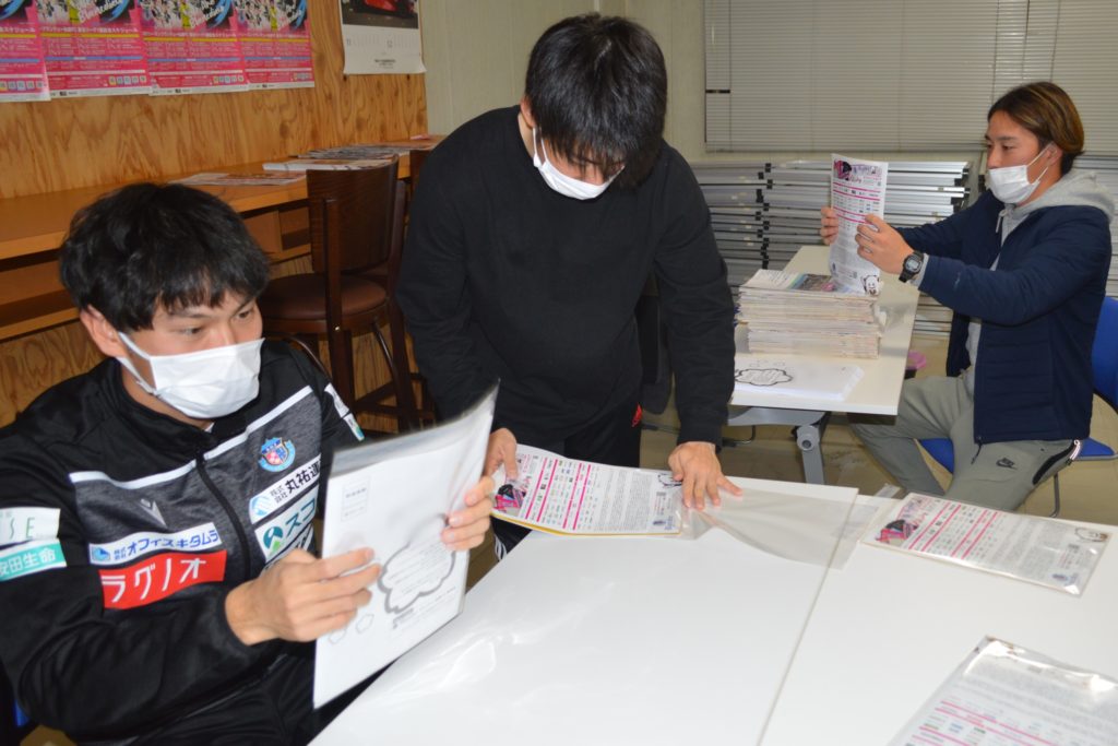 今回の発送準備には仕事を終えた選手たちも駆けつけ、会員の皆様の1年間の応援に感謝を込めながら封入作業をしました。