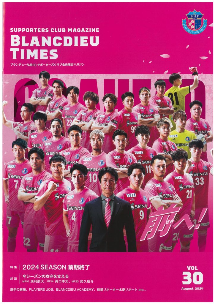 サポーターズクラブ会員限定マガジン「BLANCDIEU TIMES VOL30」 発送のお知らせ クラブ2024.08.19 ブランデュー弘前FCでは、サポーターズクラブ会員限定マガジン「BLANCDIEU TIMES VOL30」の発送準備を行いましたのでお知らせします。 VOL30の対談企画は、今シーズンの攻守を支える浅利選手・眞口選手・知久選手の3人!そして新コーナー「桜援リポーター水愛リポート」もできました! サポーターズクラブ会員の皆様は到着を楽しみにお待ちください。 東北リーグ1部 第10節 試合結果9/8(日)ホームゲーム 無料サッカー教室開催のお知らせ