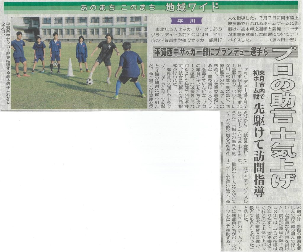 この度ブランデュー弘前FCでは、7月7日(日)に平川市陸上競技場で開催される第9節ラグノオスペシャルマッチvsコバルトーレ女川戦に先駆け、平川市立平賀西中学校のサッカー部へ訪問指導させていただきましたのでご報告いたします。