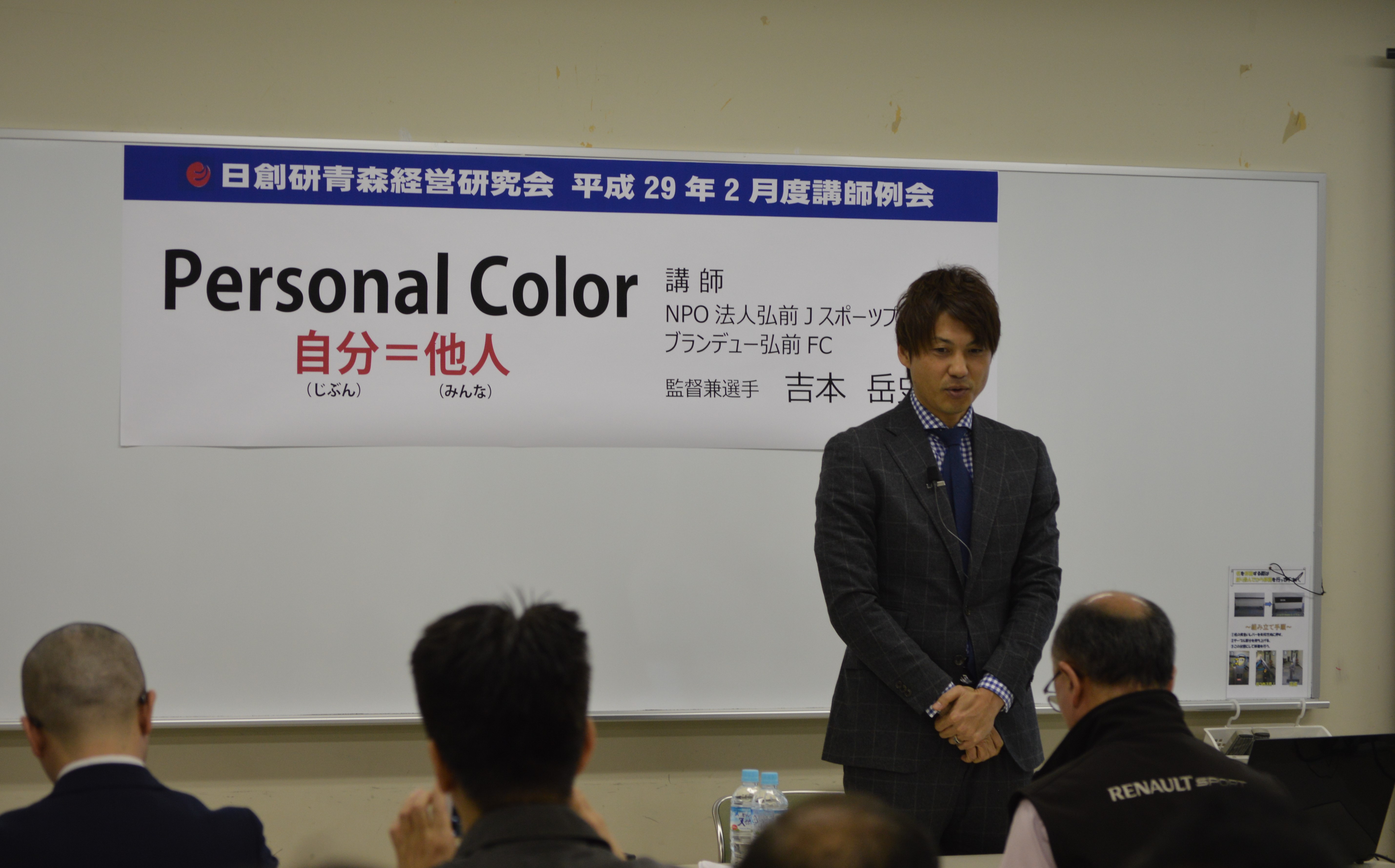 日創研青森経営研究会 2月度例会 吉本監督講演のご報告 クラブ2017.02.16 この度、ブランデュー弘前FCでは、2月15日に行われた、日創研青森経営研究会2月度例会に吉本監督が講師としてお招きいただき、講演をさせていただきましたのでお知らせいたします。 講師としてお招きいただいた日創研青森経営研究会様ありがとうございました。 2017シーズンサポーターズクラブ 入会のご案内 設置のお知らせサポートショップ新規加盟店のお知らせ