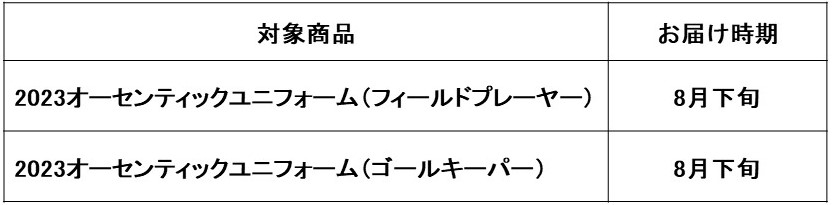2023年4月10日〜 5月1日までの期間限定で受注販売を実施した2023シーズンオーセンティックユニフォームにつきまして、7月中旬~7月下旬頃のお届けを予定しておりましたが、納品が遅れており大変申し訳ありませんがご注文いただいた皆様へのお届けは8月下旬頃となります予定です。
