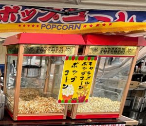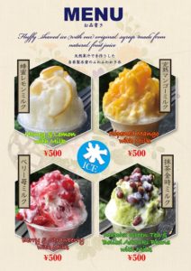 種類豊富な味のかき氷 !暑い日はオリジナルかき氷メニューがオススメです。また大きなジャンボフランクフルトはお腹を十分満たしてくれます。大人気のキャラメル味ポップコーン&定番の塩バター味も人気です。