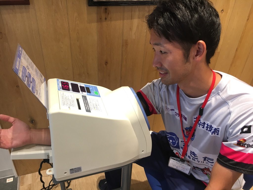 荒井選手は献血するのは初めて!400mlの献血をすることに!まずは、説明を受けたあとに血圧を計る荒井選手。