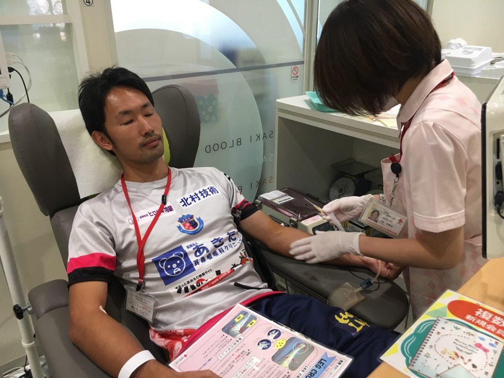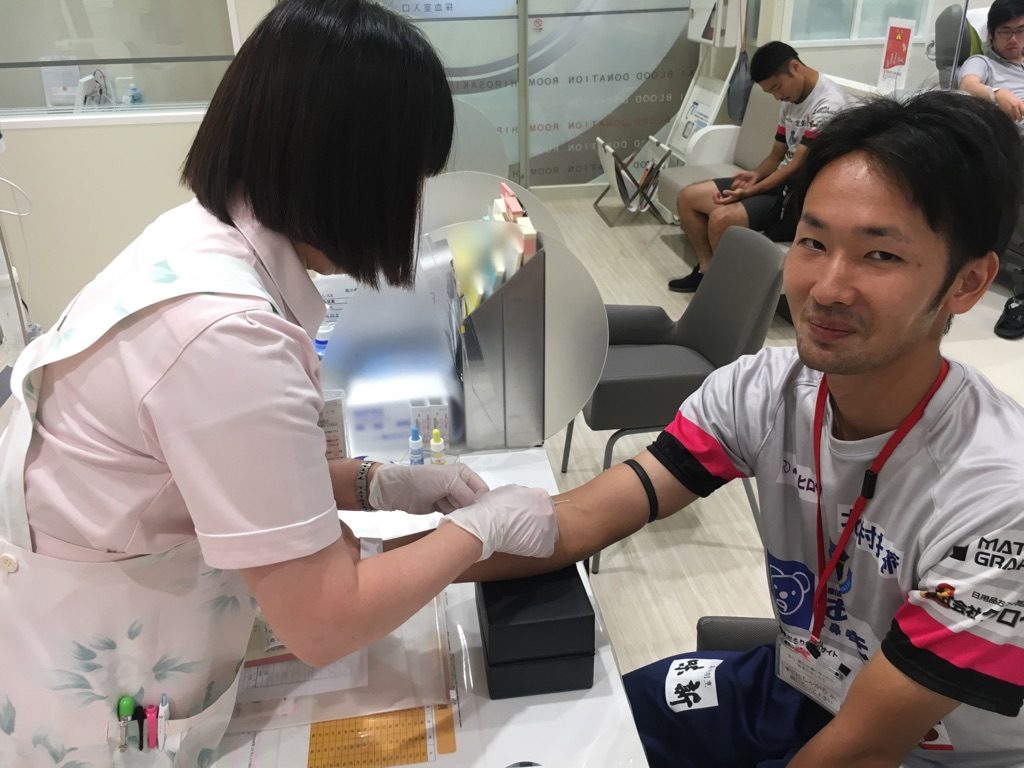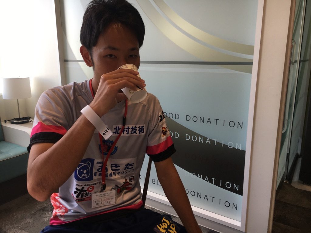 献血の前に採血をして血液型の確認。荒井選手は、間違いなくAB型でした。
