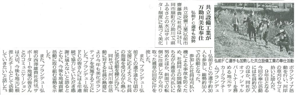 ブランデュー弘前FCでは、共立設備工業㈱様が実施する「県ふるさとの水辺サポーター制度」に基づく美化ボランティア活動にご協力させていただきましたので、ご報告いたします。