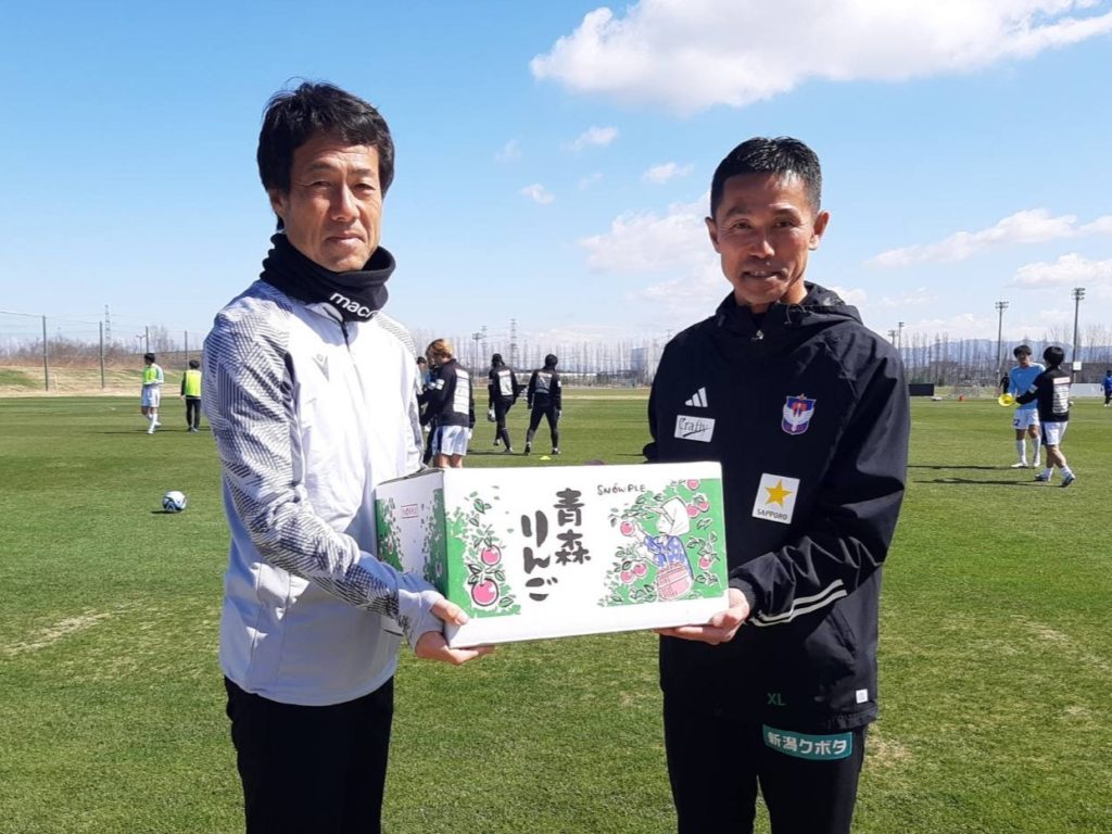 [ブランデュー弘前FC山本監督からアルビレックス新潟松橋監督へりんごとりんごジュースの寄贈]
